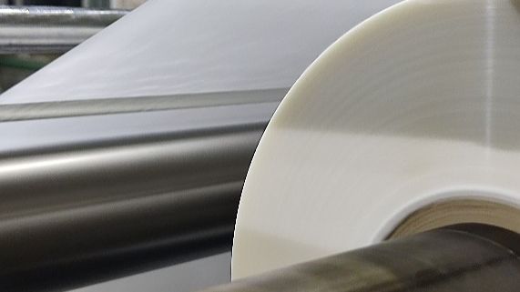 Резка и перемотка рулонов пленки для ламинирования.