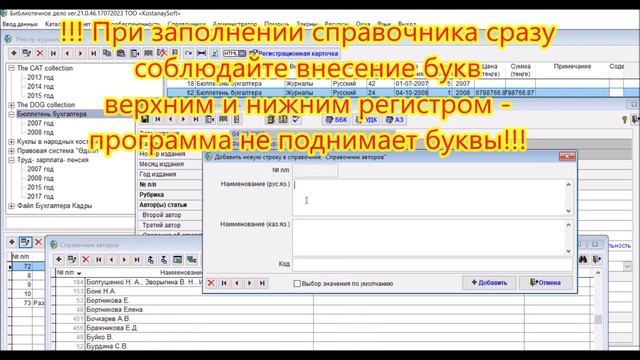 Внесение нижним регистром букв в поле [сведения об ответственности]: 00:01 при отсутствии признак "Запретить поднимать в верхний регистр заглавные буквы название авторов"; 07:18 при установленном признаке "Запретить поднимать в верхний регистр заглавные буквы название авторов"; 05:43 Внесение сведений об ответственности через кнопку справочник (при снятом признаке); 09:04 Внесение сведений об ответственности через кнопку справочник (при установленном признаке); 09:26 Копировать » Вставить значения в справочниках АБИС:KostanaySoft; 09:58 Поиск и просмотр статей в каталоге; 11:28 Авторские права на программу АБИС; 11:35 Канал в телеграм для библиотекарей; 11:42 Наши контакты - обратная связь; 12:02 Пользователи АБИС:KostanaySoft. ----------------------------------------------------------------------------------------- Комплект автоматизированной библиотечно - информационной системы "Библиотечное Дело" включает в себя следующие модули: - Модуль "Комплектования / Каталогизации", - Модуль "База данных читателей / Посещаемость библиотеки" - Модуль "Книгообеспеченность", - Модуль "Администратор", - Модуль "Штрих-кодирование", - Модуль "Заказ периодики", - Модуль "Календарь знаменательных дат, календарь событий", - Модуль "Создание электронной библиотеки книг, статей и др. документов", - Модуль "Web - компонента поиска", - Модуль "Экспорт-импорт фонда в формате UNIMARC. RUSMARC", - Модуль "Формат обмена данными с Республиканской межвузовской электронной библиотеки (РМЭБ)", - Модуль "Создание полнотекстного варианта оглавления (содержания) книг, журналов и газет", - установочный диск - 1 диск, - ключ USB - 1 шт., - инструкция по установке и работе с программой (А4) - 1 шт. - бесплатное автоматическое обновление ПО при запуске программы или скачивание с сайта www.kostanaysoft.com - оперативные консультации по электронной почте, телефону, - удаленная помощь в установке, обучении с помощью программы TeamViewer В стоимость программного комплекса "Библиотечное Дело" включаются все модули. ☎️ +7-705-540-98-73 WhatsApp. Viber. инстаграм @kostanaysoft Сайты kostanaysoft.kz kostanaysoft.com ******************************** Оформить заявку на программы KostanaySoft удобно по ссылке http://www.kostanaysoft.com/index/formuljar_zakaz/0-15 ******************************** #ФорумБиблиотечноеДело #ФорумБиблиотекарей #ЧитальныйЗал #КостанайСофт #БиблиотечныеБудни #Книгообеспеченность #АБИС #абискостанайсофт #читатели #отчетностьбиблиотекаря #библиотекарьшколы #абисKostanaySoft #библиографическоеописание #сделановказахстане #библиотечнаясистема #библиотекарь