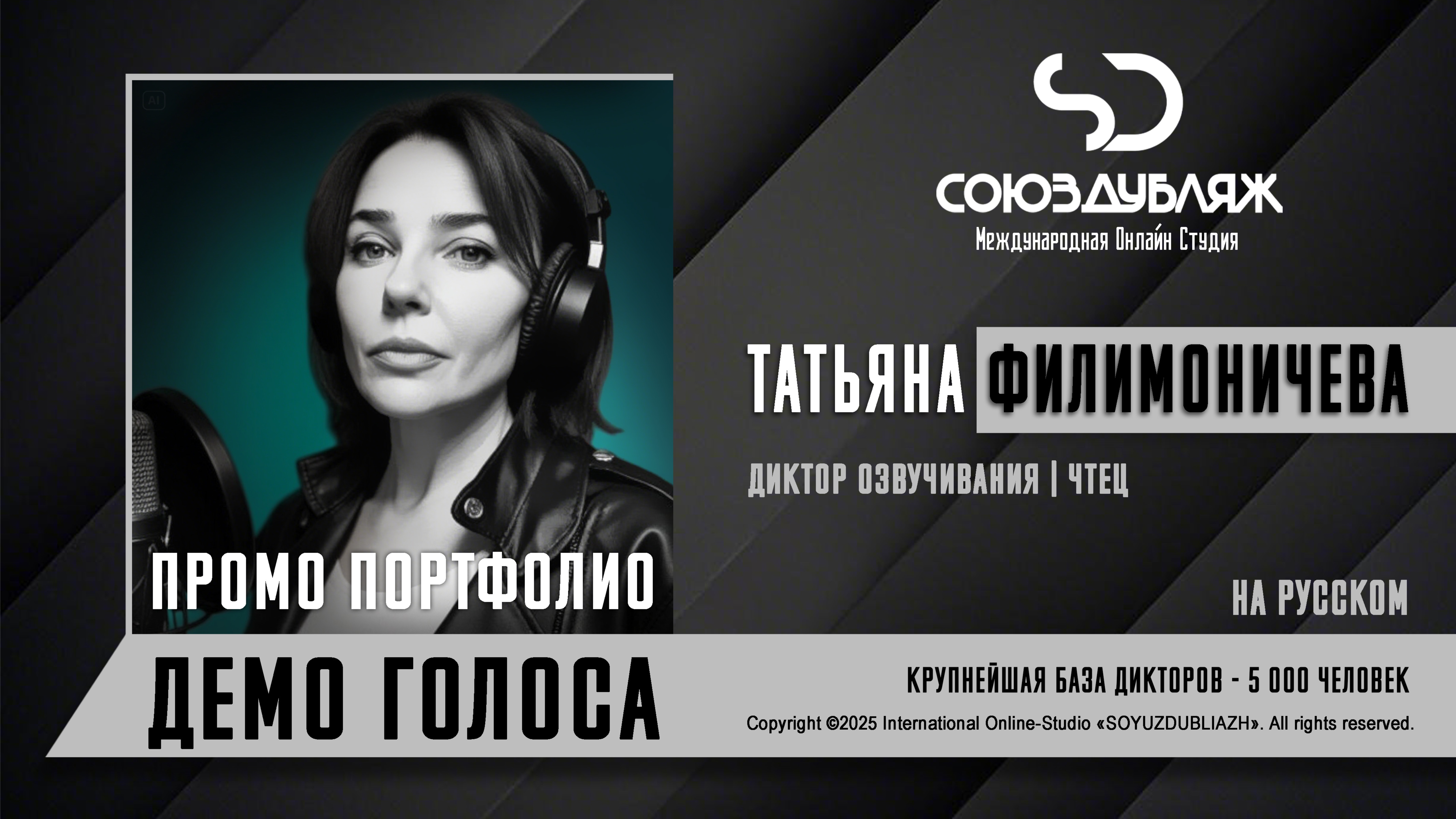 #СоюзДубляж #БазаДикторов #Озвучка ✔️Татьяна Филимоничева, диктор озвучивания-чтец. Международная Онлайн-Студия "СОЮЗДУБЛЯЖ" - профессиональная озвучка и дубляж. ▪️Рабочая группа в Телеграм: https://t.me/soyuzdubliazh ▪️Контакт для связи: https://t.me/SoyuzAdmin ▪️Подпишись:https://www.youtube.com/c/SOYUZDUBLIAZH ▪️Сайт: https://www.soyuzdubliazh.com/ Лучшие голоса для вашей аудиорекламы и видеороликов. База дикторов - 5 000 человек, профессионального уровня на ENG| FR| TR| RU| ISR| AZ| UA| KZ| UZ| языках. Мужские и Женские топовые голоса для озвучки любых проектов, таких как: Рекламы, Презентации, Фильмы, Сериалы, Игры, Мультфильмы, ТВ Шоу, Аудио-видео визитки. ✔️Сотрудничая с нами вы получаете свой проект под ключ, не выходя из дома или офиса. Наша слаженная команда из лучших дикторов, актёров озвучивания, режиссёров и звукорежиссёров в кратчайшие сроки озвучат или отдублируют ваш заказ на профессиональном уровне. Образцы работ нашего портфолио вы сможете посмотреть на канале СОЮЗДУБЛЯЖ. ВНИМАНИЕ: ✔️Мы приглашаем специалистов озвучки к сотрудничеству в нашей команде. Вы можете пройти по ссылке в наш телеграм канал и связаться с Админом для обсуждения. ✔️Всем заказчикам подобных медиа проектов по озвучки и дубляжу фильмов, сериалов, документалок обращаться непосредственно к Админу Телеграм группы СОЮЗДУБЛЯЖ, пройдя по ссылке: Проходи по ссылке: https://t.me/soyuzdubliazh International Online-Studio SOYUZDUDLIAZH presents a highly professional approach in voice-over and dubbing. ▪️Our working group https://t.me/soyuzdubliazh ▪️Chief manager https://t.me/SoyuzAdmin ▪️Follow https://www.youtube.com/c/SOYUZDUDLIAZH ▪️Web: https://www.soyuzdubliazh.com/ We offer You the best Voices for your Audio commercials and Video`s. Our Database contains over 5 000 voices of native speakers and high-class foreign language specialists in ENG| FR| TR| RU| ISR| AZ| UA| KZ| UZ|. Male & Female top level voices for all the variety of dubbing projects such as commercials, presentations, movies, TV-series, video and computer games, cartoons, TV-shows, audio & video portfolio’s – all in one place. As your business partner we guarantee a turn-key project without you leaving your house or office. Our target is to make sure that the dubbing of your project is made as quick as possible by a well-coordinated and professional team of the best speakers, film and sound directors. To whom it may concern! We invite dubbing specialists to join our team. Please contact our manager on Telegram https://t.me/soyuzdubliazh