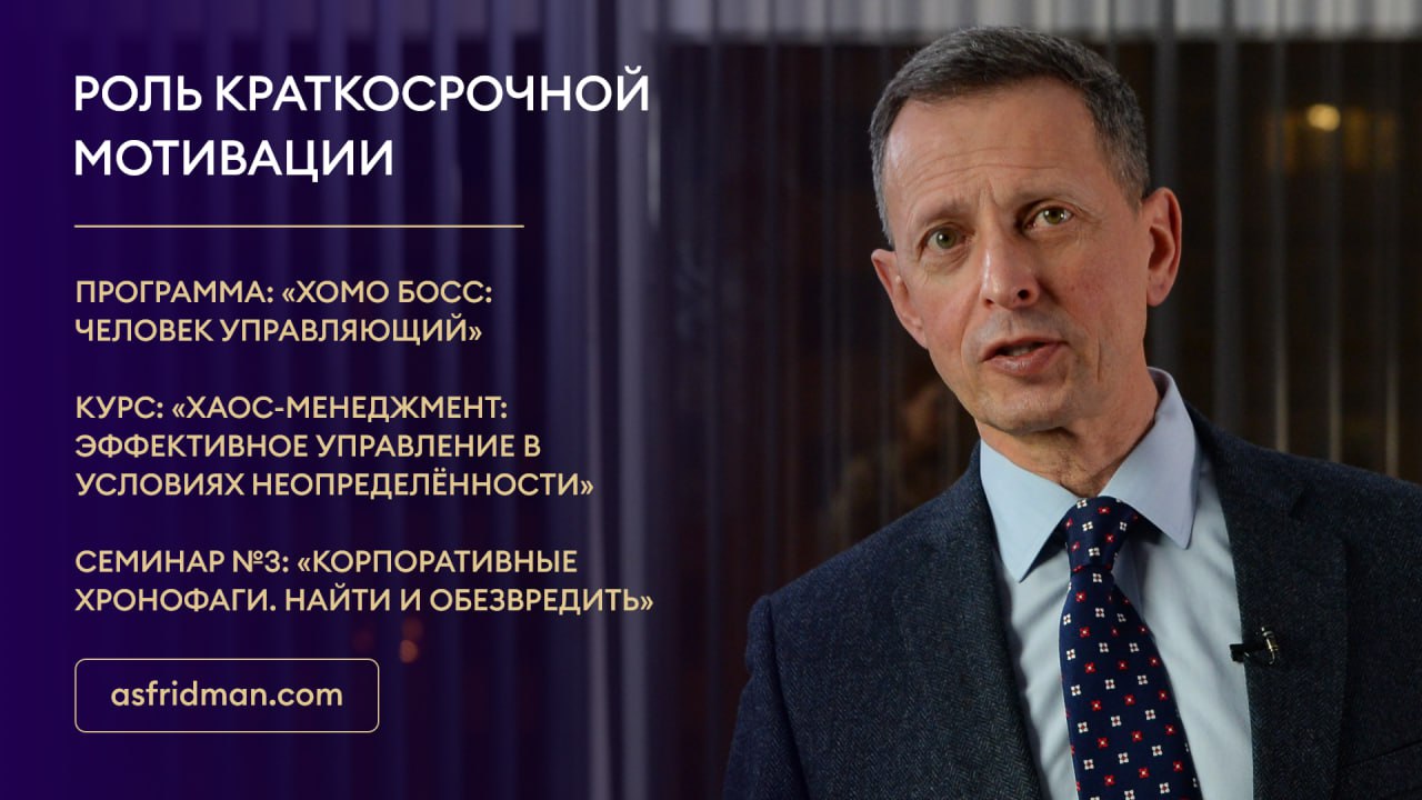 Роль краткосрочной мотивации Программа: «Хомо Босс: Человек Управляющий» Курс: «Хаос-Менеджмент: Эффективное управление в условиях неопределённости» Семинар №3: «Корпоративные хронофаги. Найти и обезвредить» Расписание открытых семинаров Александра Фридмана: https://www.asfridman.com/raspisanie/ *** Александр Фридман — эксперт-методолог по регулярному менеджменту. Специализация: настройка корпоративного управления и внедрение методик профессиональной эксплуатации сотрудников. Официальный сайт Александра Фридмана: https://www.asfridman.com/ Расписание: https://www.asfridman.com/raspisanie/ Telegram: https://t.me/asfridman VK: https://new.vk.com/fridman.management LinkedIn: https://www.linkedin.com/in/asfridman/ Книги Александра Фридмана: https://www.ozon.ru/person/fridman-aleksandr-semenovich-4044011/category/knigi-16500/ https://www.litres.ru/aleksandr-fridman/ https://www.wildberries.ru/catalog/0/search.aspx?search=александр+фридман&targeturl=ST Кадровый консалтинг от Александра Фридмана: https://fridmanfridman.ru/
