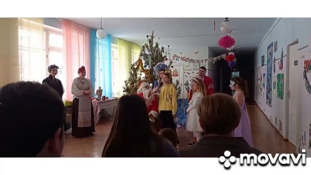в школе ёлка. Ангилине подарили подарок красная и крёсный