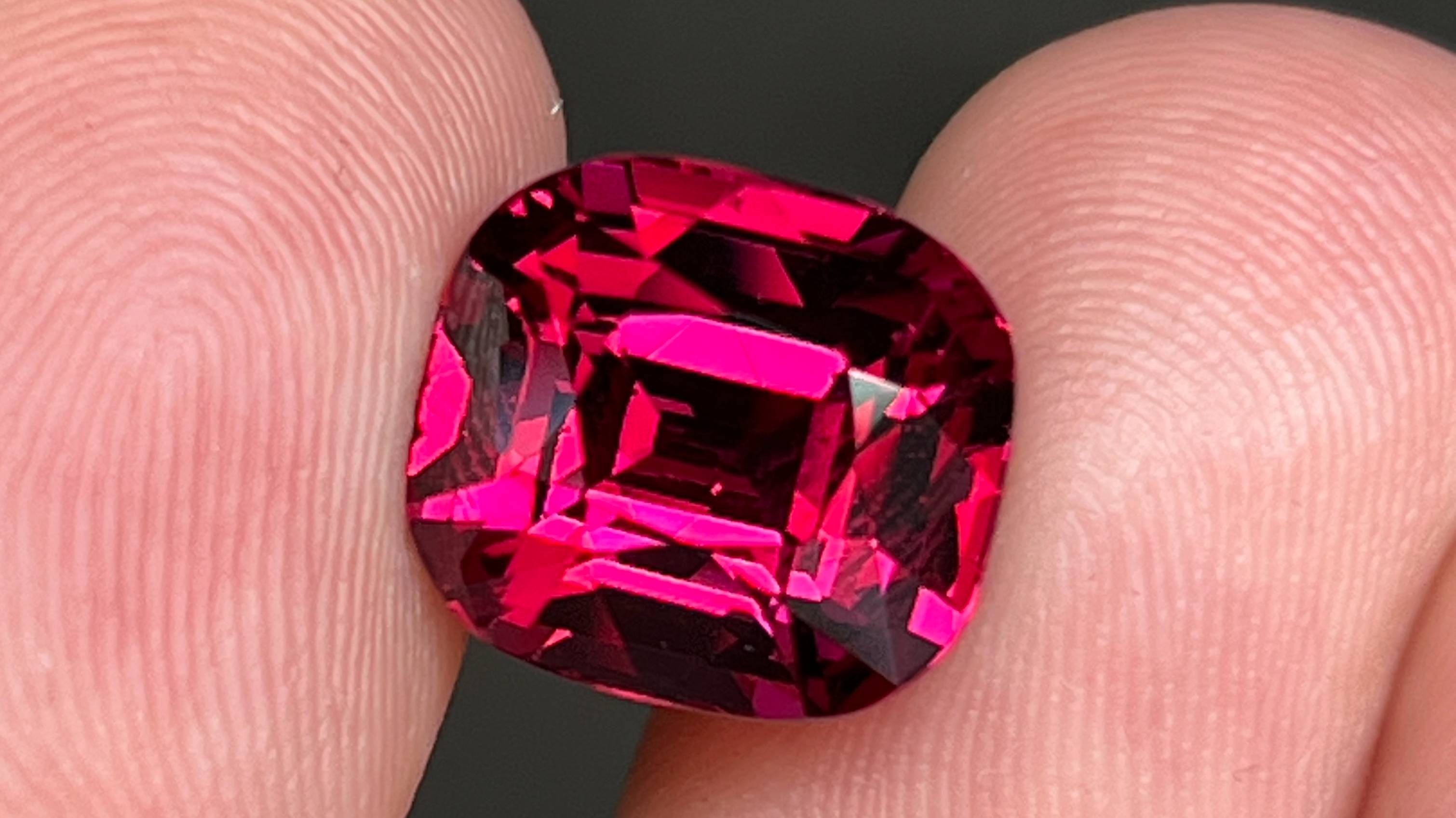 Артикул: 0386GN Наименование: Натуральный Гранат Родолит. Вес: 9.46 кт. Размеры: 12.01 х 10.84 х 8.28 мм. Огранка: Кушон комбинированная. Чистота: Визуально чистый. Цвет: Фиолетово-розовый. Тип: Гранат. Облагораживание: Отсутствует. Месторождение: Мадагаскар.