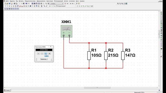 Сегодня мы будем исследовать входные сопротивления помощью мультиметра XMM1. Соберем схемы для измерения входных сопротивлений с помощью мультиметра. Одна из схем расположена вот здесь. И содержит три сопротивления соединенных параллельно. При таком соединении суммарное сопротивление равно 47,67 Ом