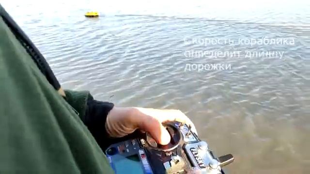 Прикормочный кораблик с установленным автопилотом UNIBOAT просыпает дорожку.
