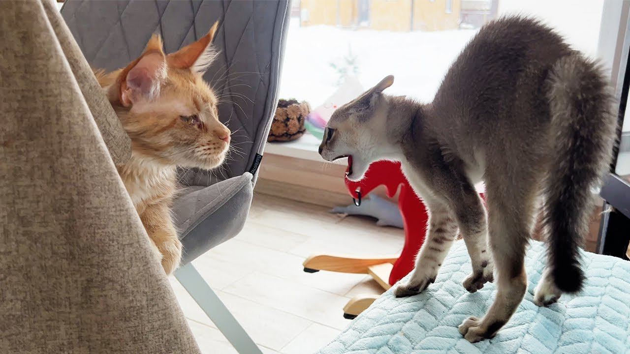 Котенок-инопланетянин первый раз вышел из своей комнаты и встретил мейн-кунов с барханными котами