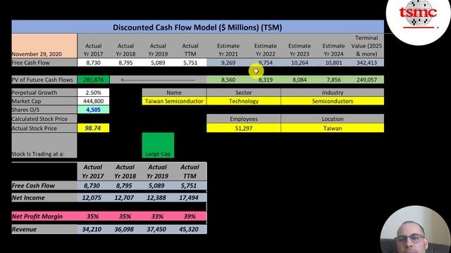 Taiwan Semiconductor Financial Stock Review: Larger than Intel & Nvidia combined: $TSM //// ? MY #1 METHOD FOR ORGANIC YOUTUBE GROWTH ➤ Rank Your YouTube Videos Higher in the Search: https://creators.essetinoartists.com/seosimplified?utm_source=scott ? ARE YOU A YOUTUBER? ➤ FREE Guide: "Top 15 Reasons Why YouTube Channels Fail to Get Views": https://creators.essetinoartists.com/getmoreyoutubeviews?utm_source=scott Let me show you how to sift through Taiwan Semiconductor’s income statement and statement of cash flows to understand their financials really well. We can run my discounted cash flow model together to see if the stock is a buy or a sell. We are also analyzing the financial ratios to see how they compare to their competitors. We will look at the debt of the company and equity. We will also calculate the WACC (weighted average cost of capital) so we can discount the future cash flows. Let's also look at the stock's dividend history to see if they are keeping up with dividend payments or are cutting their dividends. Taiwan Semiconductor's stock price may be hard to estimate but maybe can figure it out together. Taiwan Semiconductor is an Semiconductor company that may be a great addition to your portfolio. 0:00 Opening 0:25 High Level Company Detail 0:55 Financial Review 3:47 Capital Structure 4:43 Valuation Results 5:26 Historical Stock Price & Dividends 5:46 A $10,000 investment 10 yrs ago is worth how much today? 6:02 Additional Info from the company's reports 6:23 Financial Ratios 8:25 Competitor Analysis 9:11 Summarize 9:32 Closing SUBSCRIBE: Please subscribe to my channel: https://www.youtube.com/user/Rubin16241?sub_confirmation=1 MEMBERSHIP LEVELS: If you'd like me to do a: (i) private zoom call to discuss financials, (ii) custom valuation for a stock of your choice or (iii) show your support for this channel, you can become a member by clicking on the link below: https://www.youtube.com/channel/UCYRwlu3w98_bbiek8c2Y-qw/join MORE STOCK VIDEOS: Advanced Micro Devices: https://youtu.be/D1_zU3yJMlg Amkor Technology: 0 Intel: https://youtu.be/HMsHGxOaxFg Marvell Technology: https://youtu.be/6z8PG_QtqiE Micron Technology: https://youtu.be/Nq7npV3NWlw NVIDIA: https://youtu.be/MCs0thLpi1g NXP Semiconductors: https://youtu.be/6z8PG_QtqiE Skyworks Solutions: https://youtu.be/vVcIR3gij_A Texas Instruments: https://youtu.be/pkIDqpd9Or8 CONTACT: financial.business.consultant.sr@gmail.com I built this website to help small businesses value their company: http://businessvaluationappraisal.com/ Discounted cash flow (DCF) is a valuation method used to estimate the value of an investment based on its future cash flows. DCF analysis attempts to figure out the value of an investment today, based on projections of how much money it will generate in the future. This video is not intended to be investment advice. Seek a duly licensed professional for investment advice. I'm just a lowly mathematician!