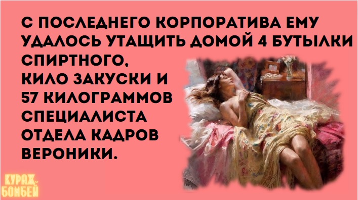 Бывают женщины прелесть какие глупенькие и ужас какие дуры! Варианты новогоднего корпоратива: премиум — 5000 руб. на персону; стандарт — 3000 руб. на человека; эконом — 1000 руб. с рыла. На вечеринке знакомятся сотрудник и сотрудница. Девушка спрашивает: — Вы женаты? — Да не очень… С последнего корпоратива ему удалось утащить домой 4 бутылки спиртного, кило закуски и 57 килограммов специалиста отдела кадров Вероники. У тебя два пути: 1) либо ты получаешь удовольствие, когда вкусно жрёшь; 2) либо когда стоишь голая перед зеркалом. Где мои 6 лет? У меня было всё: работа, квартира, машина, муж, дети... Президент, у которого у каждого гражданина по телевизору, ведёт себя иначе, чем президент, у которого у каждого гражданина по стволу. Диетологи: Перед сном обманите желудок яблоком и ложитесь спать. Желудок: Ok, размялись, разогревай котлетки. Счастливый брак — это когда первым говорит мужчина, а женщина молча слушает, а затем говорит женщина, а мужчина молча делает. Всё что нас не убивает — даёт нам неадекватное чувство юмора и нездоровые методы адаптации. Настроение: принять буддизм и отложить все дела на следующую жизнь. Нас никому не сбить с пути — нам всё равно куда идти.