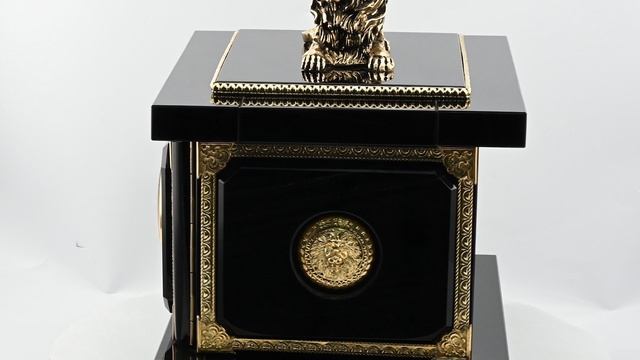 Изделие выполнено из природного камня обсидиан. Оно совмещает функциональность сейфа и эстетические качества часов, может быть установлено на каминной полке или массивном рабочем столе. •В верхней части конструкции установлена бронзовая фигура льва, который является символом победы и мужества. •Лицевая панель центральной части содержит часы с кварцевым механизмом. •Сейф оснащён кодовым замком. •Материал: обсидиан, бронза, кварцевый механизм. •Техника исполнения: камнерезные работы. •Упаковано в деревянный кейс обтянутый искусственной кожей, размер мм. •При заказе вы покупаете образец, который представлен на фотографии. Цена: 145 760 руб. https://radugakamnya.ru/catalog/suveniry_iz_kamnya/suveniry_iz_obsidiana/chasy_iz_obsidiana/seyf_s_chasami_iz_obsidiana_lev_290_255_330mm-622975/