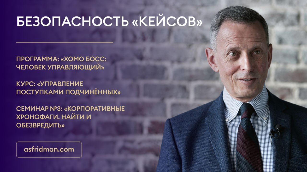 Безопасность «кейсов» Программа: «Хомо Босс: Человек Управляющий» Курс: «Управление поступками подчинённых» Семинар №3: «Корпоративные хронофаги. Найти и обезвредить» Расписание открытых семинаров Александра Фридмана: https://www.asfridman.com/raspisanie/