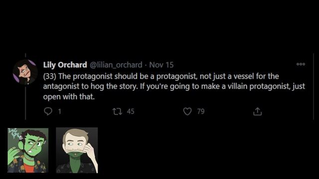 Gus Zagarella and Henry Galley are audio drama writers and members of the online indie production group: Praeps. If you'd like to listen to Less Is Morgue click the following link: https://lessismorgue.com/ Lily Orchard's twitter writing tips are anything but helpful, mostly because media exists outside of Steven Universe and She-Ra and The Princesses of Power. If you are a writer who wants to write the next Avatar: The Last Airbender or do a wholesome inverted version of Goblin Slayer or who wants to tastefully explore boobplate, don't take this advice.