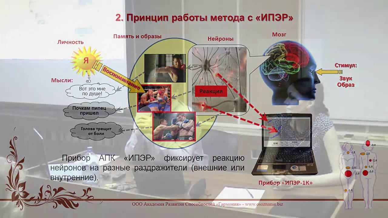 Много моих видео http://iper1k.ru/novosti.html По разным источникам от 60 до 80% всех заболеваний являются психосоматическими (из-за психических расстройств, или, как говорят в народе "из-за тараканов в голове"). Следовательно, правильным "лечением" будет проведение психологической коррекции. На мастер-классе, проводимом в клубе Профессиональной Психотерапевтической Лиги, показывается инструментальный метод нахождения и устранения психосоматических беспокойств. Ведь можно лишь только правильно поговорить с человеком, и у него исчезнет волнующее его физическое беспокойство. http://iper1k.ru/novosti/2016-03-23-psychosomatics.html Приборы для самопознания или для психологической консультации - http://www.iper1k.ru Техники саморазвития - психологическая консультация - http://www.osoznanie.biz Мой канал на youtube - https://www.youtube.com/user/Ivanovih808 --------- Подборка наших видео научных докладов по темам - спортивная психология - педагогика - самопознание - бизнес https://www.youtube.com/playlist?list=PLbNVCpO4w-QlmIzZmpEe8gqi9vSsDKw42 --------- Подборка видео-семинаров для людей, занимающихся саморазвитием и самопознанием. https://www.youtube.com/playlist?list=PLbNVCpO4w-Qk2m38hJNHIMBLvV5vT8Ap3 --------- Подборка для психологов, психотерапевтов, коуч, педагогам, медикам, социальным работникам - видео семинаров по проведению психодиагностики и психокоррекции нежелательных состояний у клиентов. https://www.youtube.com/playlist?list=PLbNVCpO4w-Ql_O5OIz6PANIWEHXdq0nGs --------- Подборка видео семинаров по межличностным взаимоотношениям, семейной жизни, воспитанию детей. https://www.youtube.com/playlist?list=PLbNVCpO4w-Qm5QjmKJqQ5HGLVeTSZaSM6 --------- Подборка для кадровиков, эйчаров, HR-специалистов, руководителей и собственников компаний - видео семинаров по отбору, проверке, обучению и управлению персоналом. https://www.youtube.com/playlist?list=PLbNVCpO4w-QnejSf2iD67U29zWeFIN912 --------- Подборка для спортсменов и тренеров - видео семинаров по спортивной психологии https://www.youtube.com/playlist?list=PLbNVCpO4w-QkZSP_MiMHns9xBPiNle6Lt --------- Все наши публикации в научных журналах, а также видео семинаров и мастер-классов, можно скачать по этой ссылке http://www.iper1k.ru/images/upload/00_publikasii_garmonii.pdf