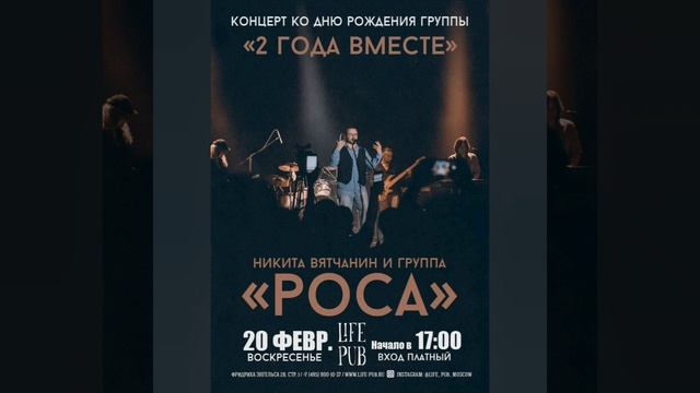 Дорогие друзья! Рады пригласить вас на концерт Никиты Вятчанина и группы РОСА ✨ДВА ГОДА ВМЕСТЕ✨ Концерт приурочен ко дню рождения группы - ждём всехбудет душевно КОГДА❓ 20 февраля ✅ воскресенье ✅17-00 ГДЕ❓клуб LifePub ✅ул. Фридриха Энгельса, 20с1, пять минут от м. Бауманская✅ ✅Билеты и бронирование столиков на сайте https://msk.kassir.ru/koncert/life-pub/rosa-2-goda-vmeste_2022-02-20 - есть видео, фото и история создания группы Цена билетов: от 250 и до 1000 руб. смотрите схему зала. Если что-то пойдет не так звоните и пишите по номеру телефона +7 985 962 12 85 Александр Портнов Отмечайте заранее день 20 февраля ⭕ в календаре, чтобы не забыть - ✨ГЛАВНОЕ✨ ДОБРАТЬСЯ ДО СВОИХ И УСПОКОИТЬСЯ ✨ С Богом