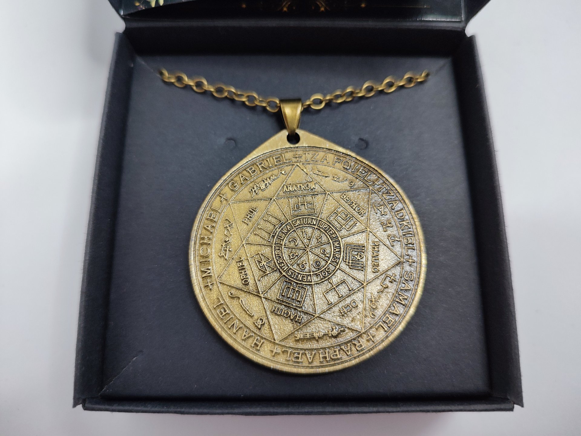 Большой диаметр - 4,5 см. (не мелочь с маркетплейсов) Длинна цепочки – 55 см. Кожаный шнурок в комплекте – 60 см. Достоверная информация (не то, что пишут в интернете и пабликах) Печать Семи Архангелов - один из самых могущественных талисманов в мире. Печать Семи Архангелов, также называемая Талисманом Семи Ангелов, считается одним из самых могущественных защитных талисманов в мире. Она имеет форму гексаграммы (семи конечная звезда), в которой написаны имена семи могущественных Архангелов: Михаэль, Габриэль, Самаэль, Рафаэль, Сахиэль, Анаэль, и Кассиэль. Михаэль/Михаил (солнце/воскресенье). Габриэль/Гавриил (луна/понедельник). Самаэль/Камаэль (марс/вторник). Рафаэль/Рафаил (меркурий/среда). Сахиэль/Задкиил (юпитер/четверг). Анаэль/Ханиил (венера/пятница). Кассиэль/Кафсиэль (сатурн/суббота) . Сама гексаграмма сочетает в себе прекрасно гармонизированный элемент женской и мужской энергии, символизируется элементами воды и огня. Рядом с именами Архангелов находятся названия и символы планет, которыми они управляют. Талисман несет латинское предложение «нет непреодолимого пути к добродетели». Этот талисман предоставляет помощь и поддержку Силам Света и Добра всем, кто им обладает. Поддерживая интуицию, он помогает распознавать и выполнять миссию, с которой мы родились. Ангельский талисман приносит счастье всем, кто его носит. Счастье иногда не соответствует нашим ожиданиям и Ангелы, чья энергия создает магию талисмана, лучше всего знают, что подарит нам настоящее счастье. Поэтому действие талисмана часто может быть очень неожиданным и непредсказуемым. Этот символ является в первую очередь защитным символом. Вот почему он должен сопровождать нас, как в каждом совершенном магическом ритуале, так и в повседневной жизни. Это охранная печать, которая позволяет вам вызывать могущественных Архангелов, как по энергии, так и по материи, при этом абсолютно блокируя доступ к другим нежелательным энергиям. Стоит приобрести талисман, который можно повесить на шею или хранить в удобном для вам месте, чтобы всегда чувствовать себя уверенно и безопасно, находясь под защитой энергии всех 7 архангелов. Авито: https://www.avito.ru/samara/chasy_i_ukrasheniya/amulet_s_pechatyu_semi_arhangelov_3548607288 ВК: https://vk.com/market-100247465?w=product-100247465_9573035%2Fquery