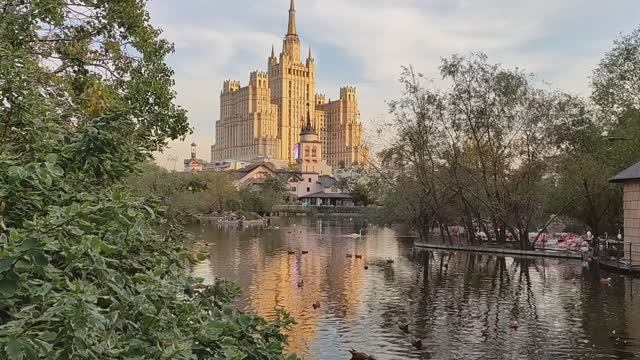 Московский зоопарк. Птичий пруд. Утки, гуси, лебеди, розовый фламинго. Красивый пейзаж!