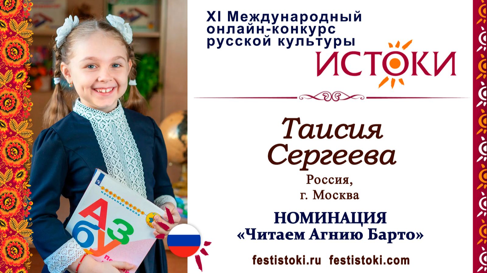 Участник ХI Международного онлайн-конкурса русской культуры "Истоки". Номинация "Читаем Агнию Барто". Стихотворение "Болтунья". Автор А.Л.Барто. Сайт: festistoki.ru / festistoki.com E-mail: festistoki@mail.ru