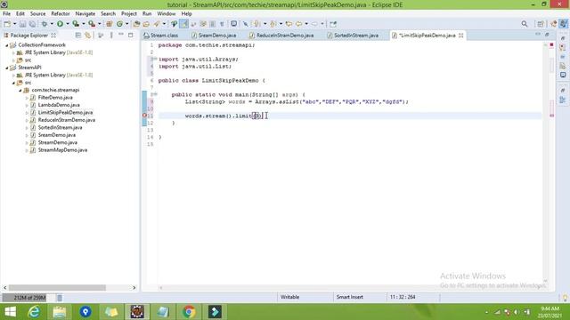 06 Limit method in Stream api Returns a stream consisting of the elements of this stream, truncated to be no longer than maxSize in length. Stream() method in stream apiin java A sequence of elements supporting sequential and parallel aggregate operations. The following example illustrates an aggregate operation using stream Filter() method in java Returns a stream consisting of the elements of this stream that match the given predicate. This is an intermediate operation param predicate a non-interfering stateless predicate to apply to each element to determine if it should be included return the new stream Reduce() method in stream api: Performs a reduction on the elements of this stream, using an associative accumulation function, and returns an describing the reduced value,if any. Sorted() method in Sream api in java Returns a stream consisting of the elements of this stream, sorted according to natural order. If the elements of this stream are not Comparable may be thrown when the terminal operation is executed.For ordered streams, the sort is stable. For unordered streams, no stability guarantees are made. This is a stateful intermediate operation. Map() method in stream api in java Returns a stream consisting of the results of applying the given function to the elements of this stream.This is an intermediate operation The element type of the new stream mapper a non-interfering, stateless function to apply to each element return the new stream Limit() method in Stream api in java Returns a stream consisting of the elements of this stream, truncated to be no longer than maxSize in length. Skip() method in stream api in java Returns a stream consisting of the remaining elements of this stream, after discarding the first {@code n} elements of the stream.If this stream contains fewer than n elements then an empty stream will be returned. Peek() method in stream api Returns a stream consisting of the elements of this stream, additionally performing the provided action on each element as elements are consumed from the resulting stream. what is stream api in java8? java8 Stream api, Stream api in java 8 in detail, Stream in detail, what is Stream api in java, what is stream api in java8? java8 Stream api, Stream api in java 8 in detail, Stream in detail, what is Stream api in java, what is stream api in java8? java8 Stream api, Stream api in java 8 in detail, Stream in detail, what is Stream api in java, what is stream api in java8? java8 Stream api, Stream api in java 8 in detail, Stream in detail, what is Stream api in java, what is stream api in java8? java8 Stream api, Stream api in java 8 in detail, Stream in detail, what is Stream api in java, what is stream api in java8? java8 Stream api, Stream api in java 8 in detail, Stream in detail, what is Stream api in java, what is stream api in java8? java8 Stream api, Stream api in java 8 in detail, Stream in detail, what is Stream api in java, what is stream api in java8? java8 Stream api, Stream api in java 8 in detail, Stream in detail, what is Stream api in java, what is stream api in java8? java8 Stream api, Stream api in java 8 in detail, Stream in detail, what is Stream api in java, what is stream api in java8? java8 Stream api, Stream api in java 8 in detail, Stream in detail, what is Stream api in java, For more updates join: facebook page techiedeveloper : https://facebook.com/TechieDeveloper-106732767669920/?ref=bookmarks telegram : techiedeveloper : https://t.me/joinchat/r_ZFCmNDs6BhZGY1