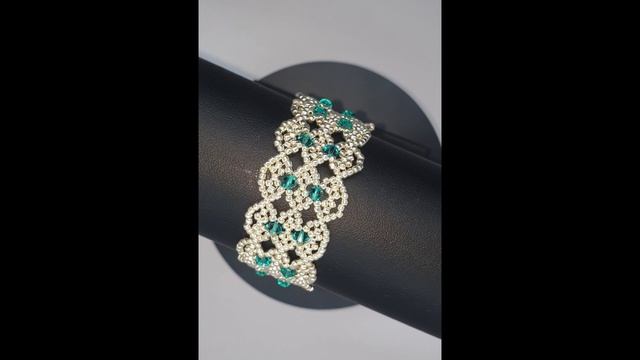 Представляем изысканное изделие — браслет, выполненный методом плетения из японского бисера, создающего замысловатый орнамент. В центре композиции выделяются кристаллы Swarovski глубокого зелёно-бирюзового цвета. Внешний облик аксессуара изящен и благороден, характеризуется аккуратностью исполнения, гармоничной симметрией и ритмичным повторением мотива.