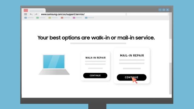 Samsung offers multiple repair options, but Mail-in repair may be the most convenient. This quick and easy video shows you how to setup your repair step by step and takes any worry out of the equation. Be sure to have your Samsung account, model number, and serial number ready, as well as proof of purchase, and then visit us here to get started: https://www.samsung.com/us/support/service/ You can read more about preparing your device for mail-in service here: https://www.samsung.com/us/support/answer/ANS00086466/