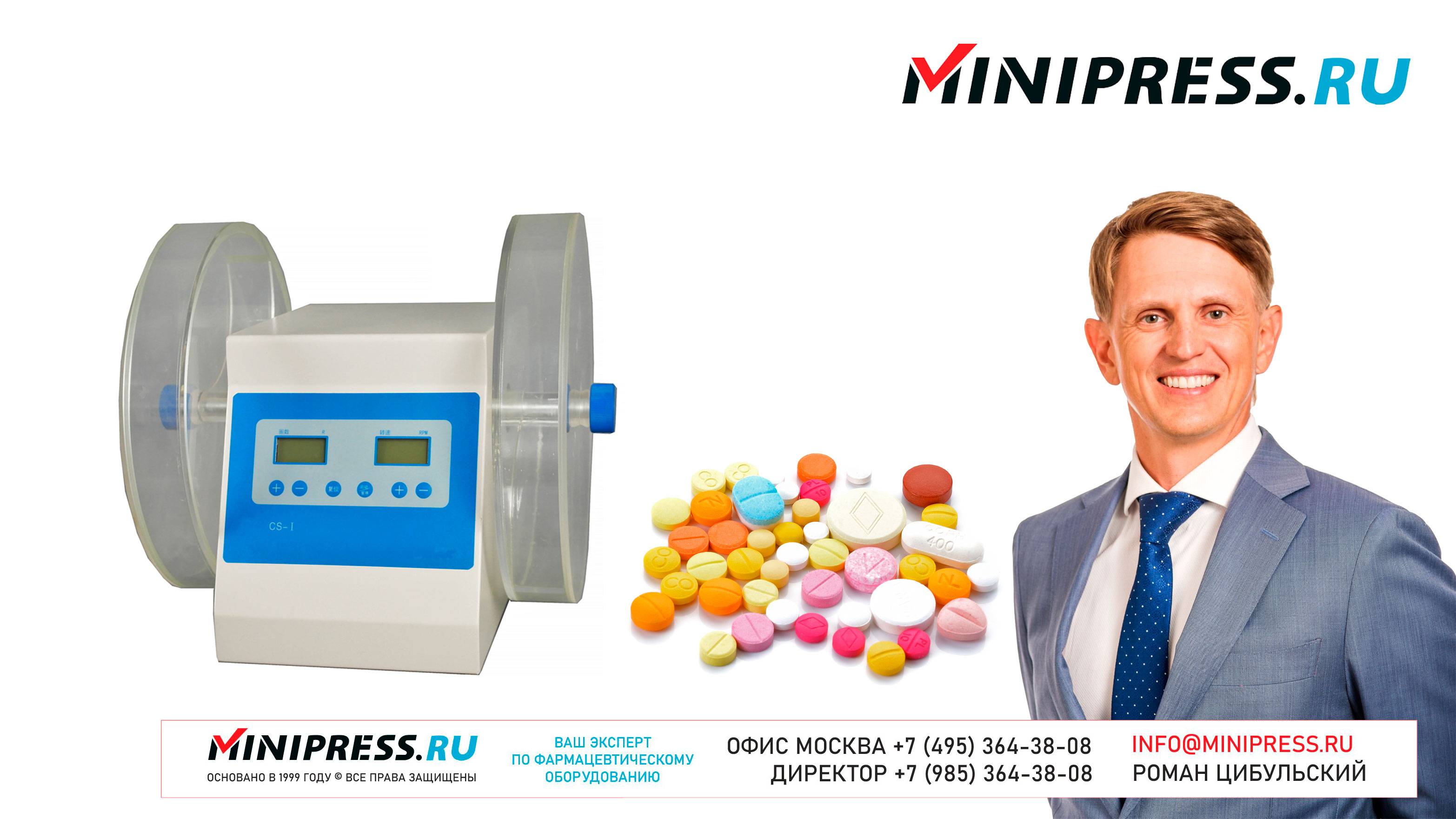 Лабораторный анализатор твердости таблеток CS-02 https://Minipress.ru/katalog/ Фармацевтическое оборудование. Специалисты в фармацевтическом оборудовании и технологиях производства лекарств. Более 20 лет оказываем нашим клиентам помощь в выборе, поставке, наладке различного фармацевтического оборудования! Вы в поиске надежного поставщика оборудования? Мы предоставим вам лучший сервис 24/7. Собрана лучшая команда профессионалов в фармацевтической отрасли и налажены стабильные связи с лучшими производителями. Мы не только продаем, но и производим многие модели оборудования Директор компании Минипресс Роман Цибульский Поставка фармацевтического оборудования в Россию Пишите: info@minipress.ru Телефон +7(495)364-38-08; Мобильный +375(29)308-00-00 Россия, Москва Skype: RomanTsibulsky; ICQ: 310-134-490 Подписывайтесь на наш видео канал на Youtube https://youtube.com/user/wwwMinipressru Обновленный сайт https://Minipress.ru Каталог оборудования https://Minipress.ru/katalog/ МЫ В СОЦИАЛЬНЫХ СЕТЯХ G+ https://plus.google.com/+RomanTsibulsky/ FB https://facebook.com/roman.tsibulsky YOUTUBE https://youtube.com/user/wwwMinipressru IN https://ru.linkedin.com/pub/roman-tsibulsky/a6/933/661 БОЛЬШОЙ КАТАЛОГ ФАРМАЦЕВТИЧЕСКОГО ОБОРУДОВАНИЯ https://minipress.ru/katalog/ Постоянно обновляемый каталог различного фармацевтического оборудования с фотографиями, описаниями, видео и ценами. ПЕРСОНАЛЬНЫЙ МЕНЕДЖЕР 24 ЧАСА https://minipress.ru/katalog/ Вы общаетесь по всем вопросам, с момента первой консультации и до получения оборудования, с одним специалистом. СПЕЦИАЛИСТЫ И ТЕХНОЛОГИ https://minipress.ru/katalog/ Имеем обширные связи в фармацевтической среде, найдем любого специалиста, поможем с освоением оборудования и технологий. ОБСУЖДЕНИЕ ВАШИХ ИДЕЙ ПО ПРОИЗВОДСТВУ ПРОДУКЦИИ https://minipress.ru/katalog/ Поможем в оценке ваших идей. Большой опыт в организации различных производств и выпуске продукции. Ценные советы. ФАРМАЦЕВТИЧЕСКОЕ ОБОРУДОВАНИЕ Мы поставили перед собой задачу, помогать нашим клиентам в правильном выборе фармацевтического оборудования. Многолетний опыт подобной деятельности показывает, что многие клиенты сталкиваются, в первую очередь, с непониманием технологического процесса. Покупка оборудования должна быть финальной точкой после подробного обсуждения задачи, консультацией с производителем оборудования, отправкой сырья и материалов на фабрику, тестирования в работе. ДЛЯ ТАБЛЕТОК https://minipress.ru/katalog/category/farmacevticheskoe_oborudovanie/ Смешивание порошков, гранулирование, прессование, обеспыливание, покрытие оболочками, фасовка, упаковка, счет, нанесение логотипов ДЛЯ ЖЕЛАТИНОВЫХ КАПСУЛ https://minipress.ru/katalog/category/farmacevticheskoe_oborudovanie/kapsulyatory-dlya-tverdyh-zhelatinovyh-kapsul/ Фасовка порошков и масел, обеспыливание, счет и фасовка, упаковка, нанесение логотипов. ФАСОВКА И УПАКОВКА https://minipress.ru/katalog/category/upakovochnoe_oborudovanie/ Упаковка в пластиковые и стеклянные флаконы, блистер, фольгу, ламинированную бумагу, стеклянные ампулы, саше, стрипы, тубы, тюбики, контурную ячейку. ТЕХНОЛОГИЧЕСКОЕ https://minipress.ru/katalog/category/eksperimentalnoe-oborudovanie/ Лабораторное, аналитическое, подготовительное, отдельные машины и линии под ключ. СФЕРЫ ДЕЯТЕЛЬНОСТИ Наша компания занимается множеством направлений фармацевтического бизнеса! Предлагаем Вам посетить страницы нашего сайта https://www.Minipress.ru по различным специализациям. ОБОРУДОВАНИЕ ДЛЯ НАКЛЕЙКИ ЭТИКЕТОК НА БУТЫЛКИ АМПУЛЫ ФЛАКОНЫ https://minipress.ru/katalog/oborudovanie-s-otzyvami/oborudovanie-dlya-naklejki-etiketok-na-butylki-ampuly-flakony/ Автоматическое этикетировочное оборудование для этикеток на клеевой основе БЛ