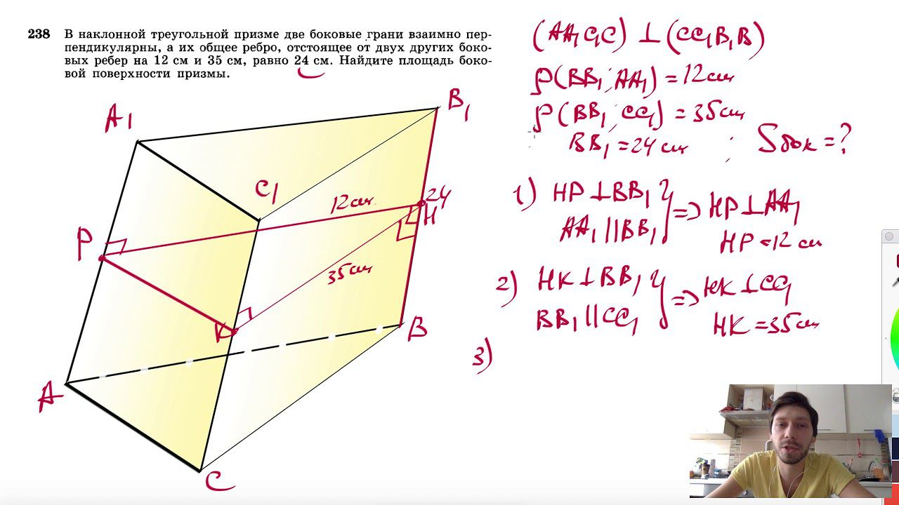 №238. В наклонной треугольной призме две боковые грани взаимно перпендикулярны, а их общее ребро, отстоящее от двух других боковых ребер на 12 см и 35 см, равно 24 см. Найдите площадь боковой поверхности призмы. Поддержать канал рублём - 5469400944002125 (Сбербанк) Мой второй канал для подготовки к ЕГЭ и ОГЭ - https://www.youtube.com/ЕвгенийСумин Инстаграм - https://www.instagram.com/EGE_OGE.math Личный инстаграм - https://www.instagram.com/ee_sumin VK - https://vk.com/evgeniysumin FB - https://www.facebook.com/EvgeniySumin