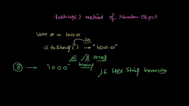 var a =1000; a.toString() returns "1000" a.toString(1) returns "1000" a.toString(2) returns binary equivalent string base 8 and 16 are also possible. Like my Facebook page: https://www.facebook.com/pages/WebTunings/339234242822202 Recommended JavaScript Book: http://www.amazon.com/gp/product/0596805527/ref=as_li_qf_sp_asin_tl?ie=UTF8&camp=1789&creative=9325&creativeASIN=0596805527&linkCode=as2&tag=webtuningscom-20 Code snippets: https://github.com/webtunings