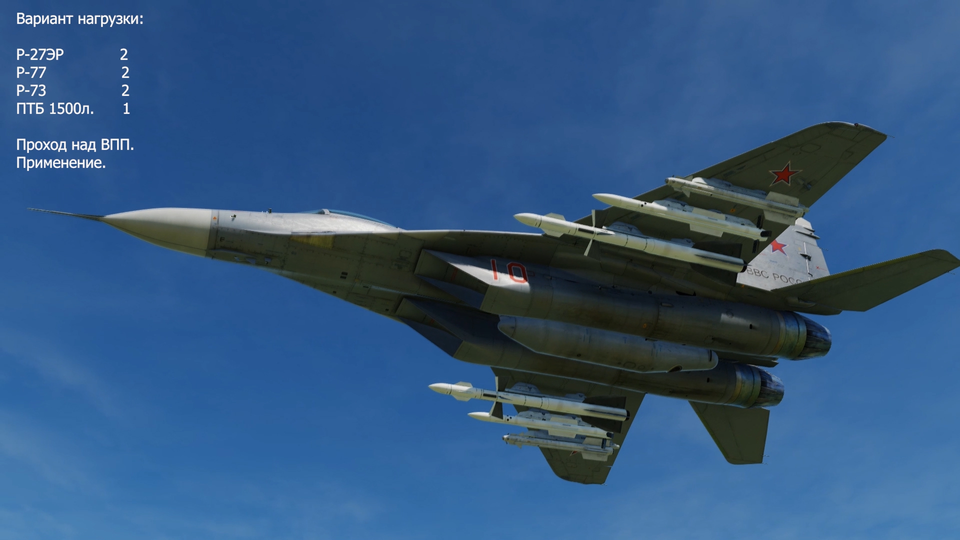 Вариант нагрузки: Р-27ЭР 2 Р-77 2 Р-73 2 ПТБ 1500л. 1 Проход над ВПП. Применение