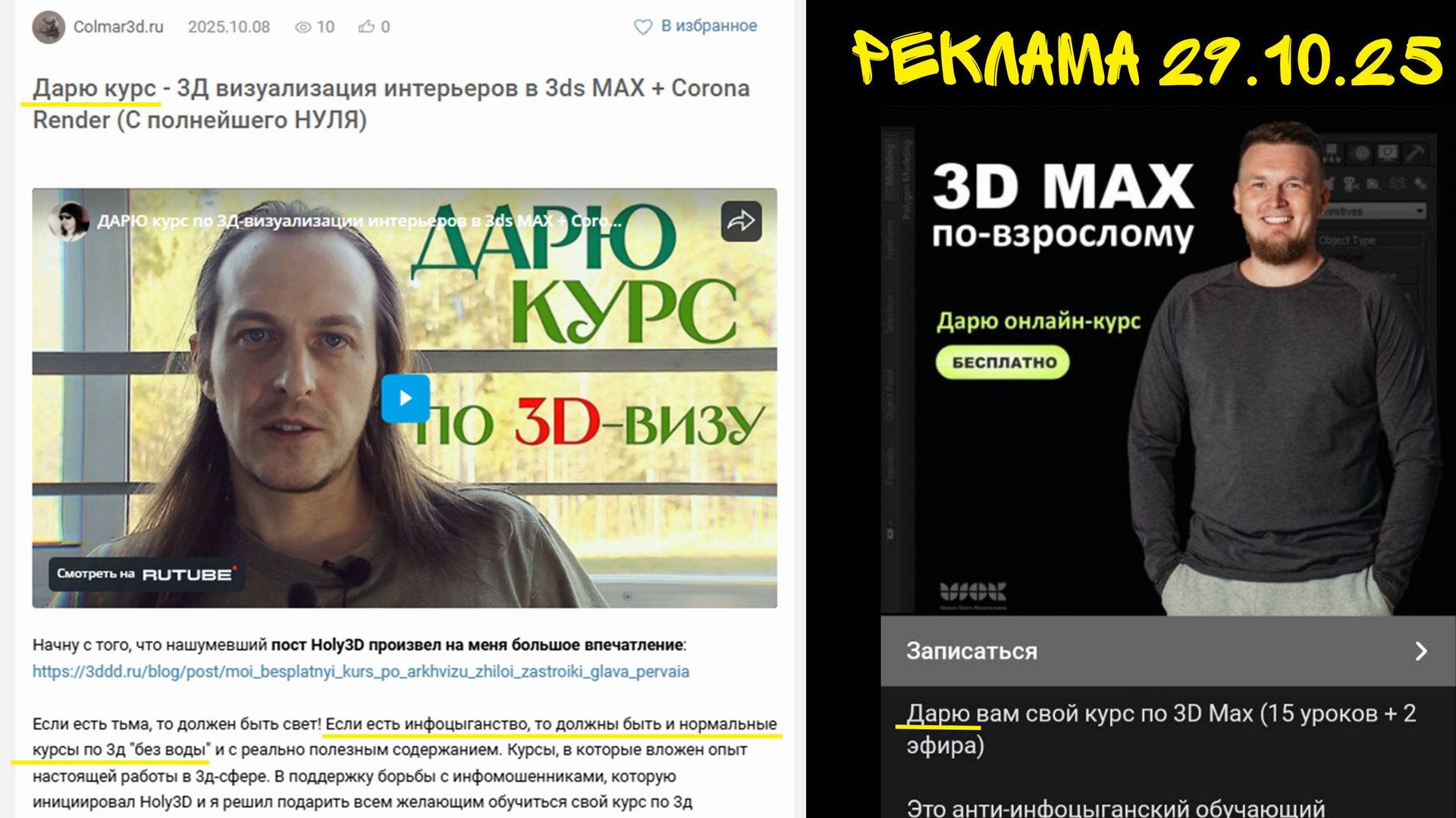 Как не сделать видео о том, что у звезды 3д-обучения в рекламе присутствует плагиат на мой пост, вдохновленный Holy3d, который удалили модераторы на сайте 3ддд. И сегодня я снова создал пост о факте плагиата (который доблестные модераторы 3ддд удалили в течение часа!!!) и о чудо сам Олег Кононыхин вышел на связь и подтвердил факт плагиата, скинув ответственность за это на своего непослушного маркетолога. А как вы считаете способна ли звезда 3д на плагиат чужих постов? --------------------------------------------- #обучение3д #дарюкурс3д #3dmax #3dmaxtutorial #coronarender #3двизуализация #3dmax #3дмакс #дизайнинтерьера #дизайн #3dmax #3dviz #курсы3д #3d
