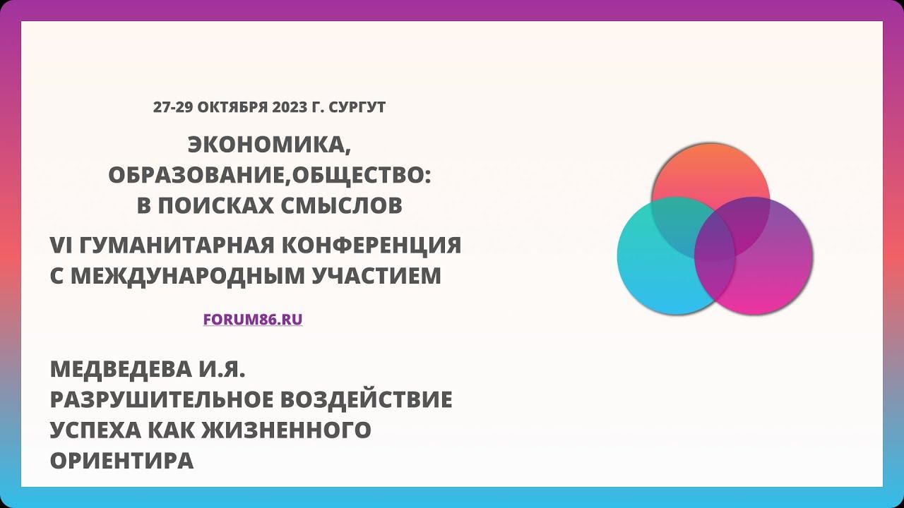 27-29 октября 2023 года состоялось знаковое для Югры и России событие — VI гуманитарная конференция с международным участием "ЭКОНОМИКА, ОБРАЗОВАНИЕ, ОБЩЕСТВО: В ПОИСКАХ СМЫСЛОВ". С подробной информацией и историй конференции вы можете ознакомиться на сайте https://www.forum86.ru/ Ирина Яковлевна Медведева Детский психолог. Писательница, публицист, драматург, общественный деятель. Главный научный сотрудник Института детства Российского детского фонда. Член Союза писателей России. Москва. Разрушительное воздействие «успеха» как жизненного ориентира.