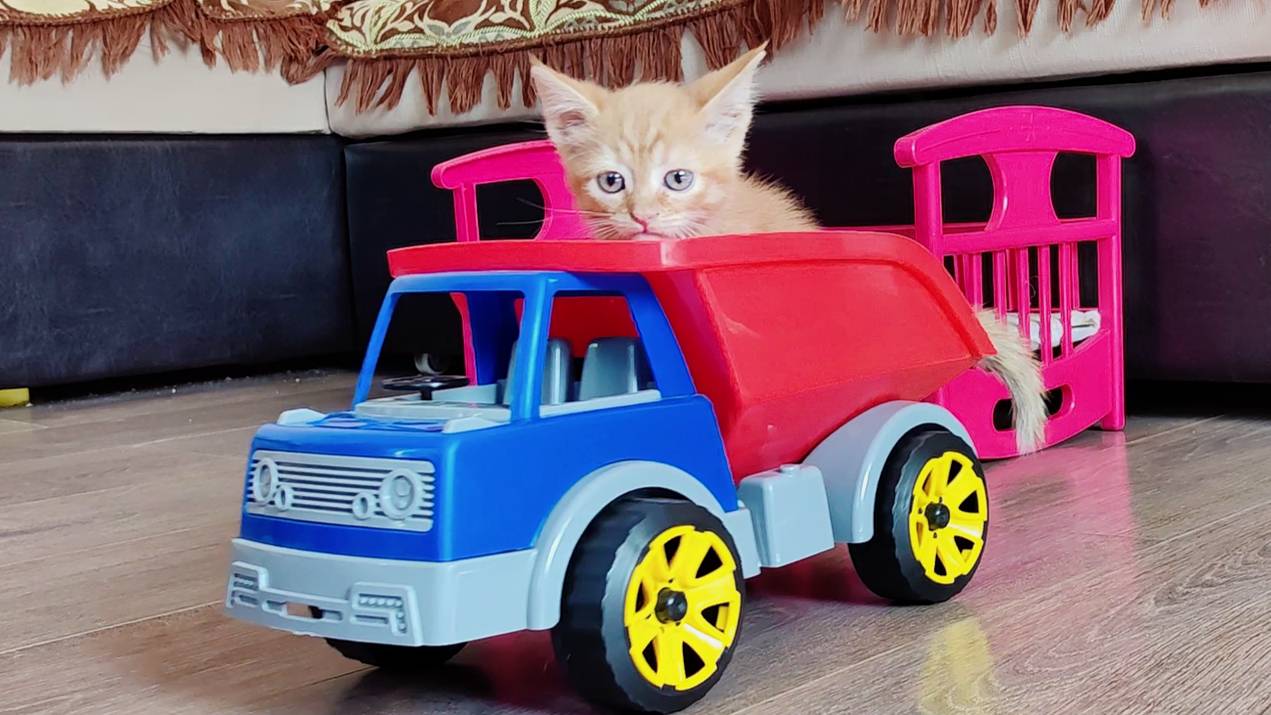 Котята играют с игрушечными машинками.