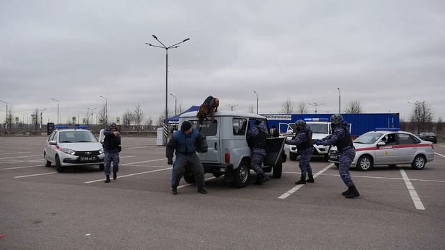 Видеозарисовка. В рамках выставки "Экспотехностраж - 2024" сотрудники вневедомственной охраны совместно с войсковыми нарядами, в том числе специалистами-кинологами, демонстрируют действия по задержанию условных вооруженных преступников, совершивших разбойное нападение и пытающихся скрыться.
