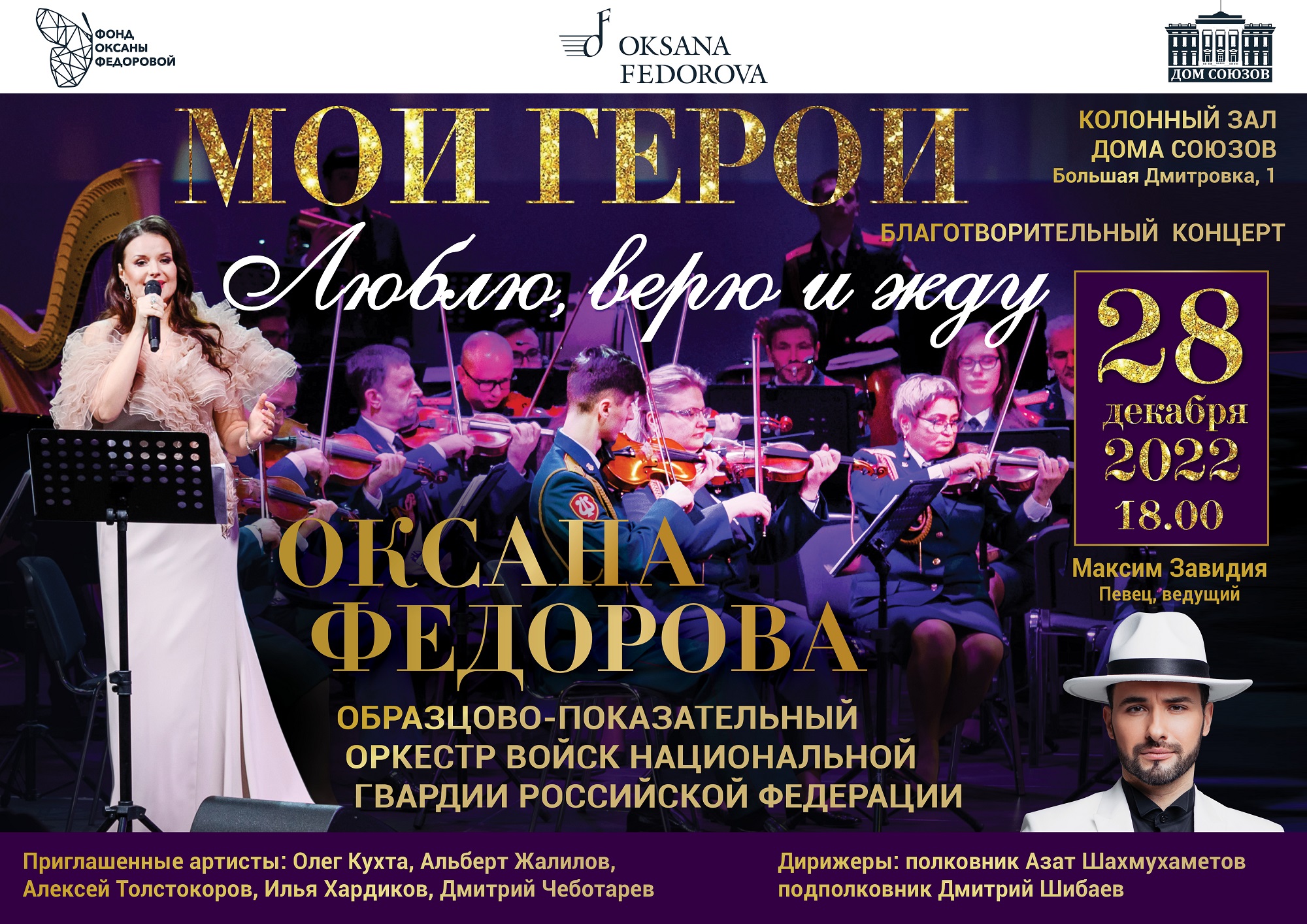 28 декабря 2022 года в Колонном зале Дома Союзов состоялся благотворительный концерт «Мои герои. Люблю, верю и жду» в поддержку семей военнослужащих, добровольцев и мобилизованных, участвующих в специальной военной операции. Открывая концерт, Оксана Федорова отметила: «Сегодня как никогда, важна взаимная поддержка и консолидация нашего общества под эгидой традиционных национальных духовных ценностей, принципов гуманизма, милосердия и патриотизма. А музыка всегда была и будет мощной объединяющей силой, которая укрепляет моральный дух защитников Родины, дает семьям силы верить и ждать своих родных, ни на секунду не сомневаться в Победе». До начала концерта новогоднее настроение для маленьких зрителей создавали Дед Мороз и веселые клоуны, которые устроили ребятам мастер-классы и научили их интересным фокусам. Программу концерта «Мои герои. Люблю, верю и жду» составили известные песни и композиции на патриотическую и новогоднюю тематику в исполнении Оксаны Федоровой и солистов Образцово-показательного симфонического оркестра войск национальной гвардии России: Алексея Толстокорова, Ильи Хардикова, Дмитрия Чеботарева и Альберта Жалилова в сопровождении Оркестра. Также в концерте принял участие ученик ДМШ им. Й. Гайдна Илья Понти, победитель Международного конкурса юных музыкантов «Моя Россия: музыкальное путешествие», который с 2021 года проводится Фондом Оксаны Федоровой. В качестве почетного гостя с приветственным словом к участникам концерта выступил Сергей Миронов, Председатель Социалистической Политической партии СПРАВЕДЛИВАЯ РОССИЯ - ПАТРИОТЫ - ЗА ПРАВДУ, руководителя фракции "СПРАВЕДЛИВАЯ РОССИЯ – ЗА ПРАВДУ" в Государственной Думе Федерального Собрания РФ.