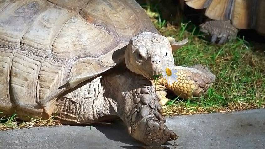 Шпороносная черепаха поела травку, сходила на свидание и закопалась в песок, спасаясь от жары.
