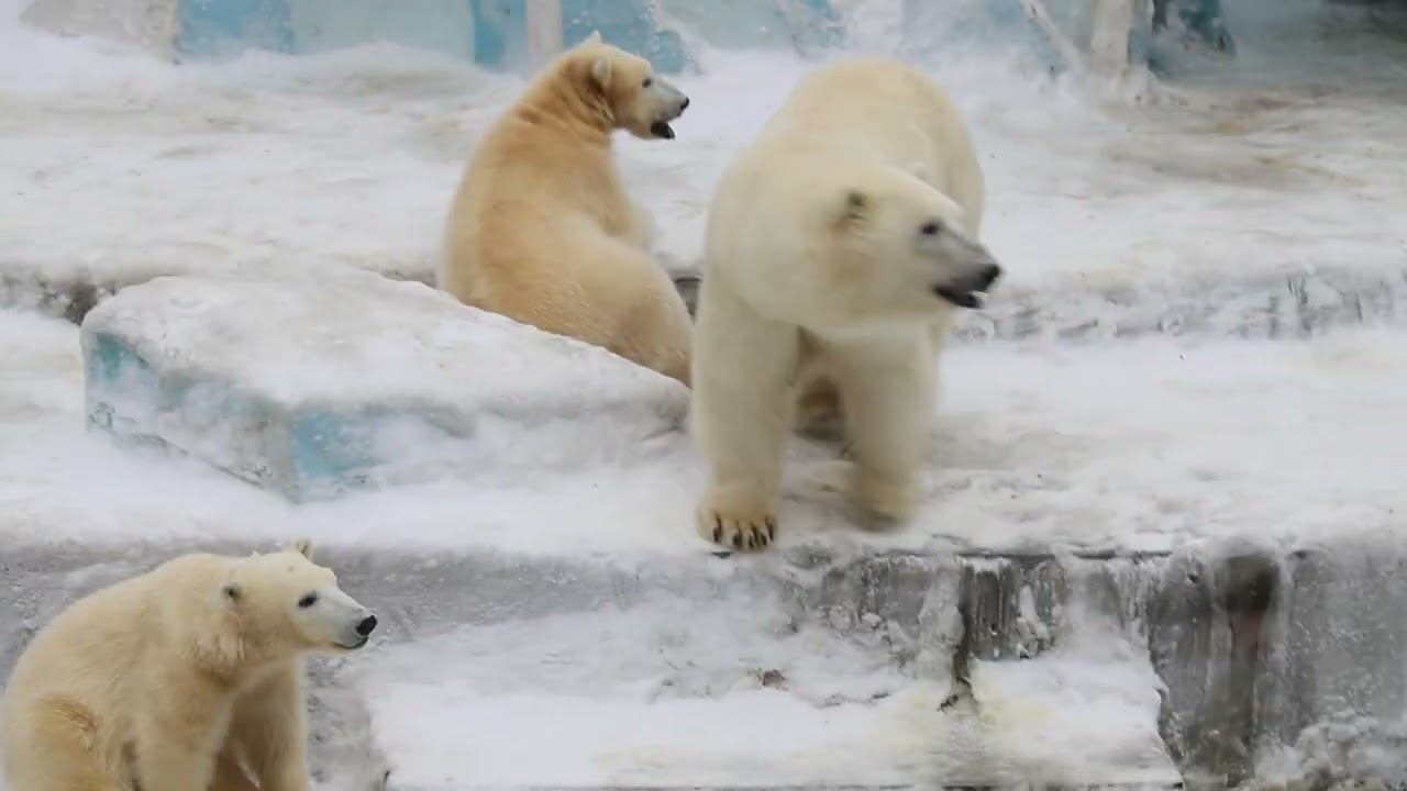 Герда родилась в Москве 20 ноября 2007 года. Её мама Симона, папа Врангель. В Новосибирск переехала 05.08.2008. В 2013 году у Герды и Кая родилась Шилка. В 2015 году она переехала в Японию. В 2015 году родился Ростик. 6 декабря 2018 года он переехал в Китай. В 2018 году родились Норди и Шайна. Сейчас они находятся в нашем зоопарке в закрытой от посетителей хозяйственной зоне. В другие зоопарки их не могут отправить. Сначала была пандемия, сейчас границы закрыты и санкции. Белые медведи Норди и Шайна содержатся в МУП «Новосибирский зоопарк имени Р. А. Шило» с рождения и по настоящее время. Данная пара молодых медведей находится вне экспозиции зоопарка, поэтому посетители не могут их видеть. Передача молодых медведей в другой зоопарк пока не планируется, — ответили на запрос редакции в пресс-центре мэрии Новосибирска. У них есть бассейн, игрушки. Их так же кормят как и раньше. Голодные не бывают. Шайна размером с маму, Норди с папу. Шайна командует Норди. Одиночные животные. Как правило, миролюбивы по отношению друг к другу, но между самцами в брачный период случаются стычки. Взрослые самцы могут нападать на медвежат. Гон с марта по июнь. Продолжительность жизни — максимум 25—30 лет; в неволе рекорд долгожительства — 42 года. Вес очень крупных самцов в некоторых частях ареала 700 и даже 800 кг: есть данные о зверях весом до 1000 кг. Обычно вес меньше. Самки всегда не только меньше, но и значительно легче самцов. Так, самцы в восточной Гренландии в состоянии нормальной упитанности весят 400—450 кг, хорошо упитанные — до 500 кг, самки, даже очень сытые, здесь же редко весят больше 350—380 кг, т. е. их вес составляет около 75% веса самцов. Длина тела на 3-й день после рождения 28—32 см, средний вес — около 755 г (650—840 г). На 26-й день длина тела увеличивается незначительно — до 35—38 см, а вес возрастает до 1125—1275 г. В возрасте 60 дней самцы весят около 7 кг, самки — около 6 кг при длине тела у первых 58—60 см, у вторых 54—58 см. В возрасте 4 месяца медвежата достигают веса 22—23 кг, в 6-месячном возрасте при длине около 110 см — 40—43 кг, в 8-месячном — 58—62 кг. Длина тела в возрасте с 6 до 9 месяцев нарастает по 6—7 см в месяц. Во время зимнего сна рост почти прекращается. В зоопарке медведей кормят утром морской рыбой, хлеб с рыбьим жиром внутри, морковь, яблоки, морская капуста, яйцо дают сырое. Медвежат подкармливают молоком из соски. На ужин мясо (говядина, конина, куры или индейка). Летом и осенью арбузы, дыни, ранетки, кабачки, тыквы, огурцы. Когда показательное кормление летом бросают живую рыбу. Медвежата с медведицей находятся до 2-х лет. 16 декабря 2022 года Герда родила 2-х медвежат. И это две девочки! Имена дали 25 июня. Медвежат зовут Стрелка и Белка. Обзор вольеров белых медведей https://www.youtube.com/watch?v=mAt_b7JD0B4&list=PLGvf0V-rAHxkpGKJaWIZIUxRKgKiqV3xZ&index=17&t=0s