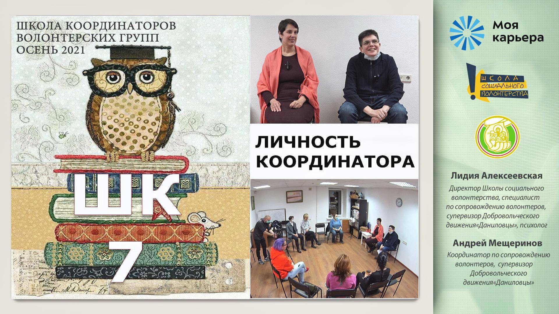 Тренинг в Школе координаторов волонтерских групп (осень 2021) https://danilovcy.ru/shk7/ Скачать презентацию-тест на самопознание: https://disk.yandex.ru/i/PObcrZV1UbJAJQ Ведущие: Лидия Алексеевская, директор Школы социального волонтерства, специалист по сопровождению волонтеров, супервизор, разработчик системы поддержки волонтеров Добровольческого движения «Даниловцы», психолог. Андрей Мещеринов, координатор по сопровождению волонтёров, супервизор Добровольческого движения «Даниловцы». Организаторы тренинга: Добровольческое движение «Даниловцы» http://www.danilovcy.ru/ Школа социального волонтерства http://volonter-school.ru/ ГБУ Центр «Моя карьера» https://mycareer.moscow/#/applicant при участии Союза волонтерских организаций и движений http://volontery.ru/