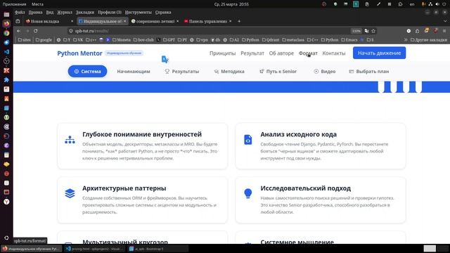 Мастерство Python через анализ архитектуры. https://spb-tut.ru Кем станет обучающийся по этой методике? Выпускник будет не просто программистом, а инженером-исследователем Python с фундаментальным пониманием языка и способностью проектировать системы любой сложности. Объектная модель Свободное владение метаклассами, дескрипторами и протоколами. Анализ Big Code Навык быстрой ориентации в исходном коде Django, Toga и других гигантов. Метапрограммирование Создание гибких и безопасных API через глубокие механизмы языка. #найтипреподавателяпитон