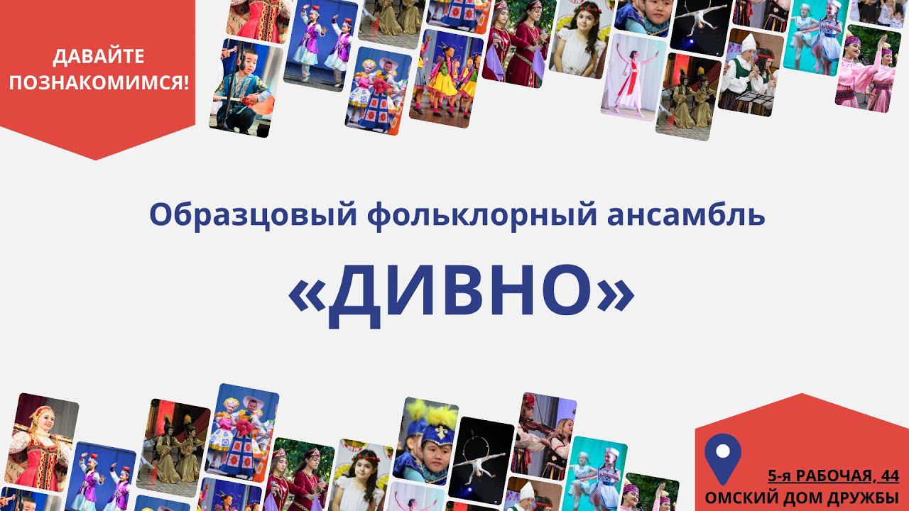 Образцовый фольклорный ансамбль «Дивно» создан в 1989 году. Этот уникальный самобытный детский коллектив известен не только в Омске, но и за его пределами. С ранних лет воспитанники ансамбля учатся любить и бережно относиться к народной культуре, русскому фольклору и передают эту любовь из поколения в поколение. Возраст участников от 4 до 19 лет. Репертуар «Дивно» включает в себя широчайший диапазон фольклорных произведений. Здесь и лирические хороводы свадебного цикла, и святочные колядки, и задорные вечёрочные песни, и озорные частушки, и казачьи песни, и современные народные песни. Каждая программа коллектива - «В родной моей сторонушке», «Самоварные песни», «Чайно-пряничная история» - своеобразное театральное действо с песнями, вовлечением в круг зрителей, приглашением их водить хороводы, играть в забытые русские игры.