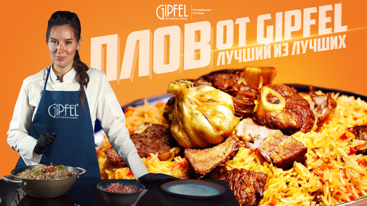 Плов Ингредиенты: * Рис сорта Девзира 800 гр * Лук 150 гр * Баранина 800 гр * Морковь 800 гр * Зира 2 ст.л * Барбарис 2 ст.л. * Масло растительное 200 мл * Чеснок * Острый перец чили Сегодня мы будем готовить плов с бараниной. Для плова мы взяли рис сорта Девзира. Замачиваем его тёплой, но не горячей водой на 1-2 часа. Классический плов готовится на курдючном жире, но мы сегодня будем готовить на растительном. Подойдёт любое растительное масло без запаха. Главное перед тем как начать жарить хорошо прокалить масло до легкого дымка. Обжариваем лук до хорошего золотого цвета. Важно дожарить лук, так как только при испарении большей жидкости из лука, масло сможет набрать нужную температуру и хорошо обжарить мясо. Добавляем не очень большие кусочки мяса. Мяса должно быть столько, что бы между ним было пространство. Именно так оно будет обжариваться. Всыпаем довольно крупную морковь и добавляем зиру. Именно сочетание двух этих ингредиентов даёт плову вкус плова. Обжариваем морковь до мягкости. Можно проверить готовность, взяв ломтик моркови , если она прогибается, значит можно вливать кипяток. Важно налить именно горячую воду. Так как если налить холодную, морковь начнёт готовиться сначала и превратится в пюре. Часто плов похож на кашу именно из-за этого. Добавляем головку чеснока, острый перец и соль. Варим без крышки 30-40 минут на самом маленьком огне. Спустя 30 минут перейдём к рису. Промываем его тёплой водой до прозрачной воды. Так мы смоем лишний крахмал и плов будет рассыпчатый. Как только мы промыли рис, сразу добавляем его сверху на мясо с морковью и не размешиваем. Смотрим, что бы рис был полностью покрыт водой. Накрываем крышку и увеличиваем огонь до среднего. Примерно через 25 минут, рис полностью сварился. Всё перемешиваем и подаём горячим с помидорным салатом и луком. Приятного аппетита! Чек-лист посуды: - Кастрюля GIPFEL https://gipfel.ru/catalog/2165/ - Доски GIPFEL https://gipfel.ru/catalog/?q=доска - Ножи GIPFEL https://gipfel.ru/catalog/6986/