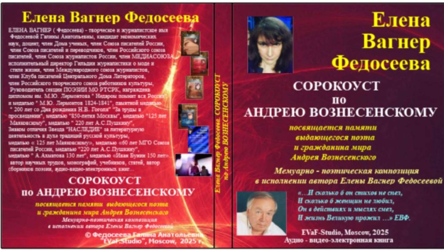 Helena Vagner Fedoseeva 2 05 2025. Выход в свет моей новой аудио-видео-электронной книги! Анонсы и полный текст на моих каналах Рутуб, ДЗЕН, ВК, Музыкально-поэтическая Гостиная Елены Вагнер Федосеевой на ВК, Телеграм-канал ЕВФ. Итак! Елена Вагнер Федосеева СОРОКОУСТ по АНДРЕЮ ВОЗНЕСЕНСКОМУ посвящается памяти выдающегося поэта и гражданина мира Андрея Вознесенского Мемуарно - поэтическая композиция в исполнении автора Елены Вагнер Федосеевой «…И сколько б он стихов не спел, И сколько б женщин не любил, Он в действиях и мыслях смел, И жизнь Великую прожил …» ЕВФ. Аудио& видео-электронная книга. EVaF-Studio, Moscow, 2025. От автора: Дорогие друзья! Представляю мою новую аудио-видео-электронную книгу « СОРОКОУСТ по АНДРЕЮ ВОЗНЕСЕНСКОМУ», посвященную памяти выдающегося поэта и гражданина мира Андрея Андреевича Вознесенского. В основу положены воспоминания автора Елены Вагнер Федосеевой о проведенном вечере памяти поэта в июле 2010 года, когда прошло ровно сорок дней с момента смерти Андрея Вознесенского. Поэтический вечер памяти "Сорокоуст Андрея Вознесенского" был огранизован в 2010 году друзьями и учениками поэта — Елена Вагнер Федосеева ( поэт, к.э.н., доц., Руководитель Музыкально-поэтической гостиной Финансовой академии при Правительстве РФ, Константин Кедров (поэт, философ, д.ф.н., проф., руководитель ДООС), Маргарита Аль, Виктор Клыков и др. Мероприятие было проведено в сорок дней после смерти Вознесенского и, по словам организаторов, стало своеобразной «поэтической мистерией», где друзья вспомнили трогательные факты личного общения с А. Вознесенским, прочитали стихи поэта, свои посвящения памяти Вознесенского, говорили о поэзии и ее роли в жизни обычных людей. Кроме того, на поэтическом вечере «Сорокоуст Андрея Вознесенского» в 2010 году участники читали стихи поэта на разных языках, в том числе на французском и немецком. Некоторые произведения Андрея Вознесенского: " Сага", «Монолог Мерлин Монро», «Тишины», «Параболическая баллада», «Плач по двум нерождённым поэмам», «Гойя», «Вальс при свечах» и другие. В качестве почетного гостя на вечере выступил руководитель поэтического объединения МИД РФ, чрезвычайный и полномочный Посол Владимир Масалов. Надеюсь, информация и мемуарные воспоминания очевидцев этого события покажутся интересными и станут весьма полезными в плане переосмысления сути жизни на земле. С уважением, автор, Елена Вагнер Федосеева. Сорокоуст по Андрею Вознесенскому. СОДЕРЖАНИЕ 1.Слово автора Елены Вагнер Федосеевой 2.Уникальные видео-материалы записи вечера памяти по А. Вознесенскому в далеком уже 2010 г., запись видео-ролика российского телеканала, который демонстрировался по Центральному телевидению. 3.Воспоминания Елены Вагнер Федосеевой - Вознесенский в моей жизни. 4.Подборка стихов Елены Вагнер, посвященных А. Вознесенскому « Вечность Вознесенского». 5. А. Вознесенский - гражданин мира. Для сведения: ЕЛЕНА ВАГНЕР ( Федосеева) - творческое и журналистское имя Федосеевой Галины Анатольевны, кандидат экономических наук, доцент, поэт, писатель, художник, независимый журналист, член Дома ученых, член Союза писателей России, член Союза писателей и переводчиков, член Российского союза писателей, член Союза журналистов России, член МЕДИАСОЮЗА, исполнительный директор Гильдии журналистики о моде и стиле жизни, член Международного союза журн