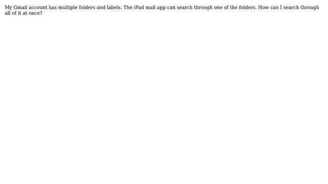 Apple: How can I search through all mail folders on my iPad? Helpful? Please support me on Patreon: https://www.patreon.com/roelvandepaar With thanks & praise to God, and with thanks to the many people who have made this project possible! | Content (except music & images) licensed under CC BY-SA https://meta.stackexchange.com/help/licensing | Music: https://www.bensound.com/licensing | Images: https://stocksnap.io/license & others | With thanks to user jtbandes (apple.stackexchange.com/users/8318), user Jason (apple.stackexchange.com/users/3842), user daviesgeek (apple.stackexchange.com/users/7833), and the Stack Exchange Network (apple.stackexchange.com/questions/22669). Trademarks are property of their respective owners. Disclaimer: All information is provided "AS IS" without warranty of any kind. You are responsible for your own actions. Please contact me if anything is amiss at Roel D.OT VandePaar A.T gmail.com