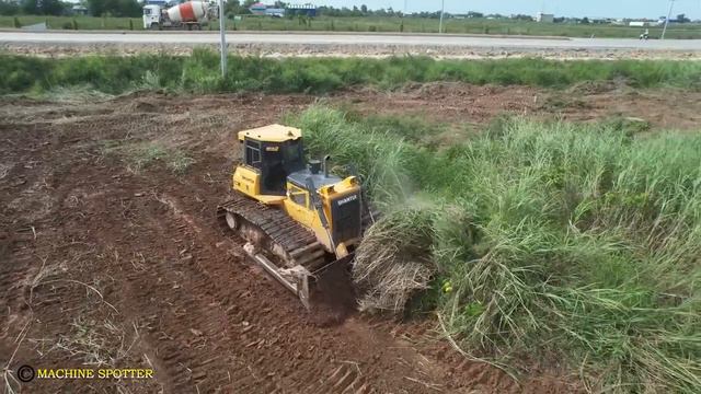 Бульдозер очищает участок от высокой травы.