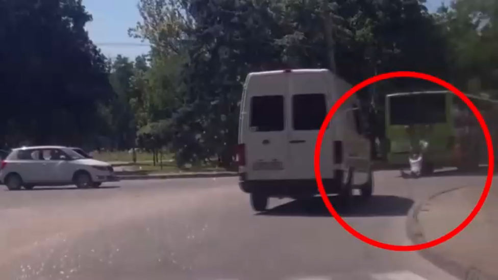 Мужик сорвался с лестницы троллейбуса и попал под колёса маршрутки, после аварии встал и пошёл как будто ничего не произошло. В дтп никто не пострадал.