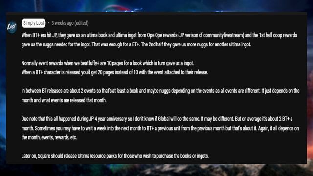ALRIGHT, GUYS!! Time to talk about a rough estimate on how much Global will be getting Ultima Books & Ingots which is needed to realize BT weapons into BT+. Become a Member and support the channel and earn some spicy perks that no one else has! https://www.youtube.com/channel/UCS1kxmXEK7-jwmLXbAFmOdQ/join ------------------------------------------------------------------------------------ Twitch: https://www.twitch.tv/simplylost30 Twitter: https://twitter.com/simplylost30 Discord: https://discord.gg/bj4wsh3N9U **Thank you to LeoBob & Zetakai on Discord for the translations read in my videos!** DissidiaDB: https://dissidiadb.com/ Dissidia Compendium: https://www.dissidiacompendium.com/ Tonberry Troupe: https://www.tonberrytroupe.com/home DissidiaInfo: https://dissidiainfo.com/ Outro Music: https://youtu.be/9AQ-IQzeYqA #dffoo #operaomnia #dissidiaoperaomnia Heavensward expansion now included in the Free Trial! Play up to level 60 for free without time restrictions. FINAL FANTASY is a registered trademark of Square Enix Holdings Co., Ltd. © SQUARE ENIX CO., LTD. All Rights Reserved.