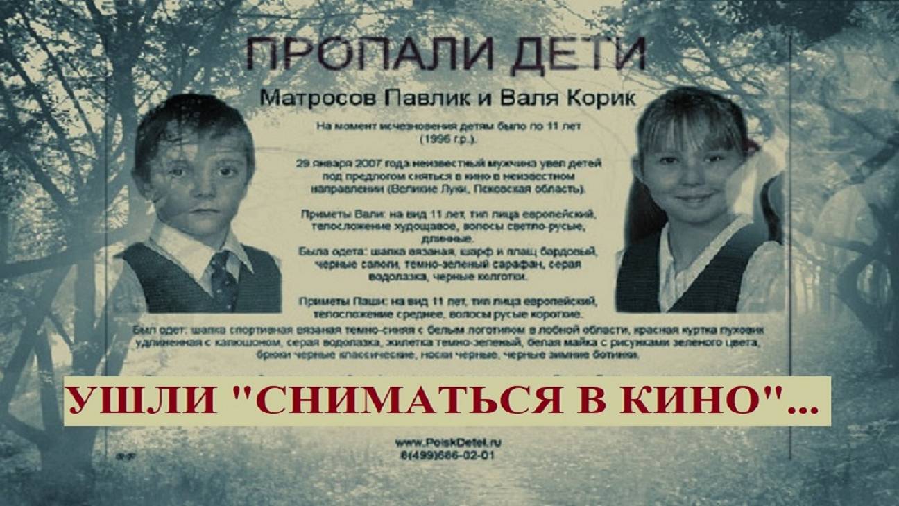 #похищениеПавлаМатросоваиВалентиныКорик#29января2007годавгородеВеликиеЛукипохищеныдети#женскийследвделе#идеальноепреступление#расследованиепоискипродолжаются#контрольследственногокомитета#найтичеловека#расследваниеновыеверсии#тйнаследствия#предсказаниеподсказки#предсказаниетаро#подсказкисудьбы#чтопроизошлонасамомделе#раскладтароанализ Адрес электронной почты для связи со мной по личным вопросам: oksana.mail.ru.10@mail.ru ВСЕХ ПРИВЕТСТВУЮ НА СВОЁМ КАНАЛЕ)! ВСЕМ МИРА, ЛЮБВИ, ЗДОРОВЬЯ И БЛАГОПОЛУЧИЯ) Предлагаю Вашему вниманию новое видео на тему: "УШЛИ "СНИМАТЬСЯ В КИНО" И НЕ ВЕРНУЛИСЬ..." ИНТЕРЕСНОГО ВАМ ПРОСМОТРА!