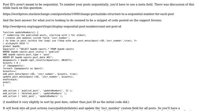 Wordpress: Display post number not post ID number Helpful? Please support me on Patreon: https://www.patreon.com/roelvandepaar With thanks & praise to God, and with thanks to the many people who have made this project possible! | Content (except music & images) licensed under cc by-sa 3.0 | Music: https://www.bensound.com/royalty-free-music | Images: https://stocksnap.io/license & others | With thanks to user Red (https://wordpress.stackexchange.com/users/2289), user goldenapples (https://wordpress.stackexchange.com/users/290), and the Stack Exchange Network (http://wordpress.stackexchange.com/questions/13083). Trademarks are property of their respective owners. Disclaimer: All information is provided "AS IS" without warranty of any kind. You are responsible for your own actions. Please contact me if anything is amiss at Roel D.OT VandePaar A.T gmail.com.
