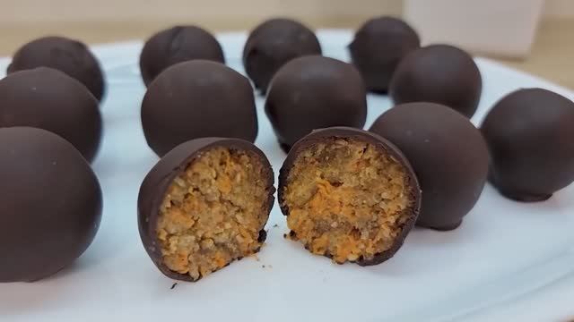 Здравствуйте, уважаемые подписчики и гости моего канала! Смешайте орехи с морковью, результат вас очень удивит. Вкусный десерт за считанные минуты. Конфеты нам очень понравились, вкус потрясающий, ингредиенты все натуральные и полезные. Сладости, которые можно есть, не беспокоясь о своей фигуре! Готовые сладости храните в холодильнике. Рецепт очень простой: ✅Ингредиенты: 80 г фиников залить теплой водой дать постоять 5 минут 1 небольшая морковь 50 г миндаля 20 г льняного семени 50 г грецких орехов щепотка соли 1 чайная ложка меда убрать в холодильник на 1 час или в морозильную камеру на 10 минут 100 г черного шоколада (без сахара), растопить немного подождать, чтобы шоколад полностью застыл Вкусные и полезные домашние сладости готовы! Спасибо, что досмотрели до конца! Приятного аппетита! Спасибо что, смотрите👀 наши ролики! Если Вам не сложно, подпишитесь🔊 на наш канал, нам будет приятно! Если Вам понравился рецепт, поставьте 💘,сделайте репост;) Для развития канала,поддержите нас пожалуйста🙏 небольшой суммой в руб.💲. Вам мелочь, а нам приятно.🌹