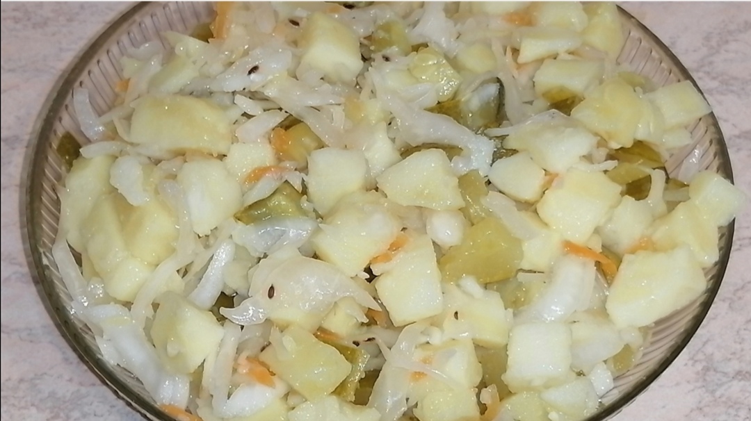 Картофельный салат с квашеной капустой, солёными огурцами и луком. Постный рецепт.