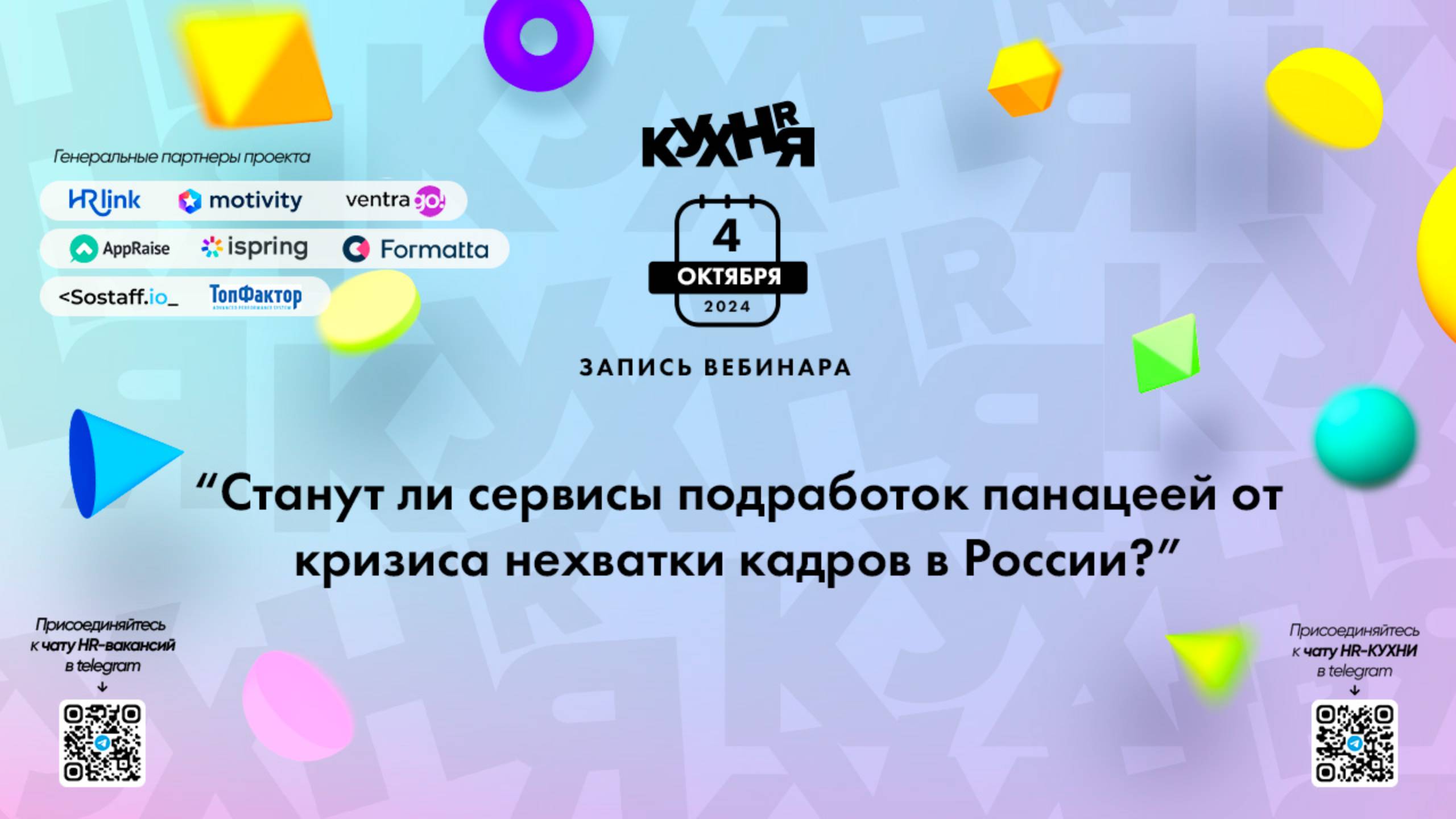 Присоединяйтесь к чатам и каналам HR-КУХНИ в телеграм: - Основной чат HR-КУХНИ в телеграм - https://t.me/+tYgAH0PgPQVkOWIy - Канал HR вакансий в телеграм - https://t.me/+CMNAN2u1hjo3M2Ri - Канал HR-EVENTS в телеграм - https://t.me/hr_kitchen - Канал HR JOURNAL в телеграм - https://t.me/hrkitchenjournal Полезные ссылки: - Каталог HR решений - https://hrkitchen.ru/exhibition - График конференций, бесплатных вебинаров, а также бесплатные курсы – https://hrkitchen.ru/ - Стать спикером HR-КУХНИ - https://hrkitchen.ru/speakers - Подписаться на полезную e-mail рассылку от HR-КУХНИ (новости, гайды, чек-листы, подарки от партнеров) - https://hrkitchen.ru/subscribe
