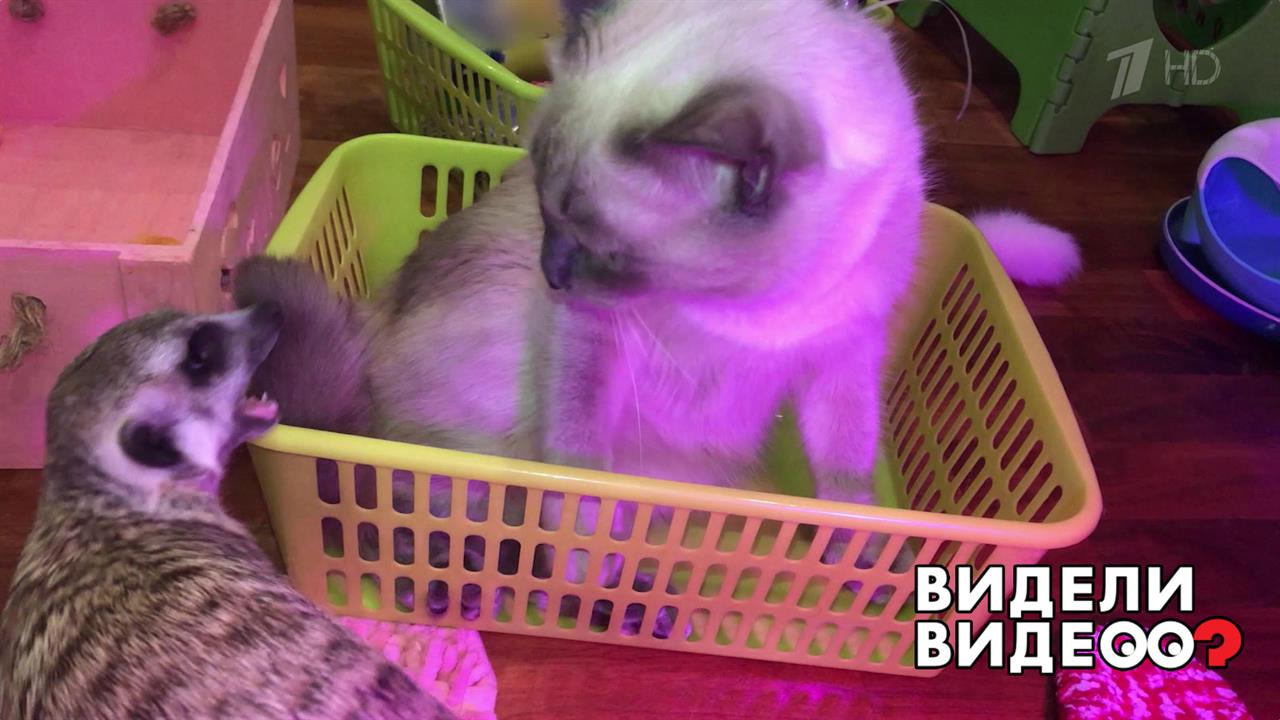Кот Кокос и сурикат Фуша дерутся из-за корзины.