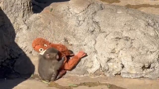 На маленького детёныша обезьяны, оставшегося без матери, напала взрослая агрессивная особь, и он убежал прятаться в объятия своей игрушечной мамы. ТГ Дядя Слава
