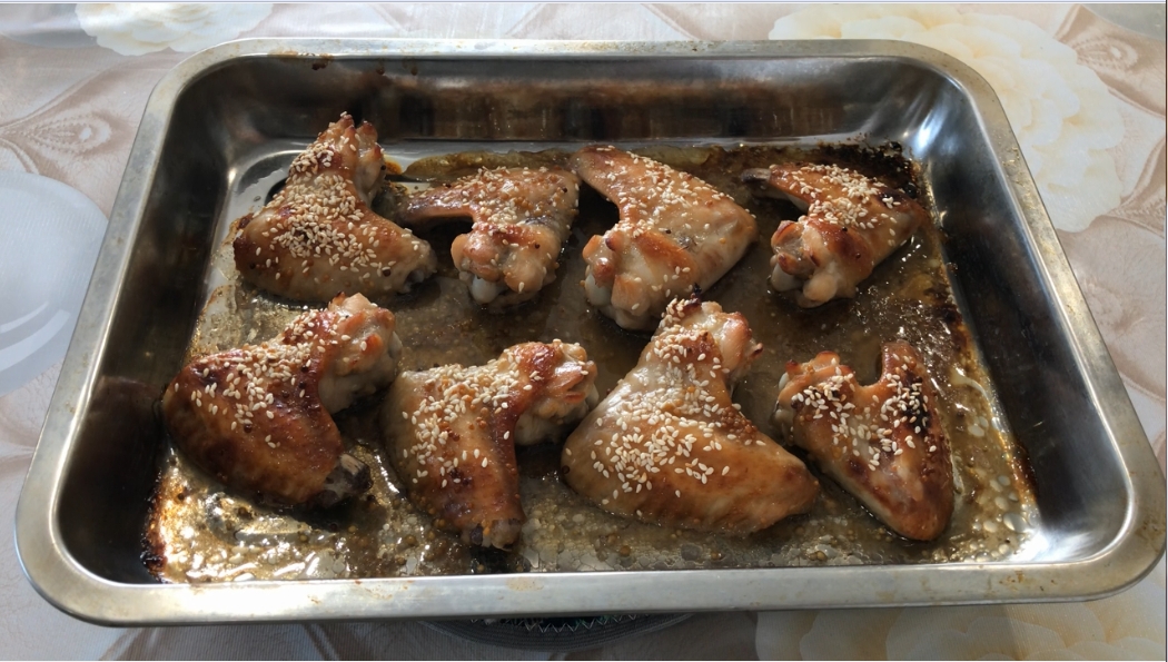 Крыло -700 гр мед - 1ст л соль по вкусу у меня - 1 ч л соус соевый - 1 ст л горчица в зернах - 1 ч л маринуем 30 мин Добавляем -1 сл л подсолнего масла выкладываем на противень в духовку t 220 на 40 мин